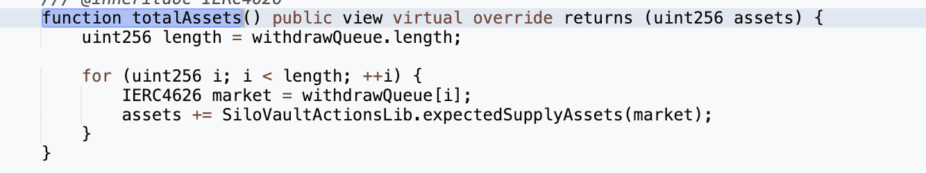 This creates the core exploit path. When bUSDC shares land in soUSDC's balance through such an external deposit, totalAssets() counts them: it iterates every market in the withdrawal queue and reads the vault's actual share balance, with no check on whether the position was voluntarily entered. Meanwhile, no new soUSDC shares are minted for these externally credited positions, because the vault's own mint logic was never invoked. The result is that totalAssets increases while totalShares stays the same, inflating the soUSDC share price.