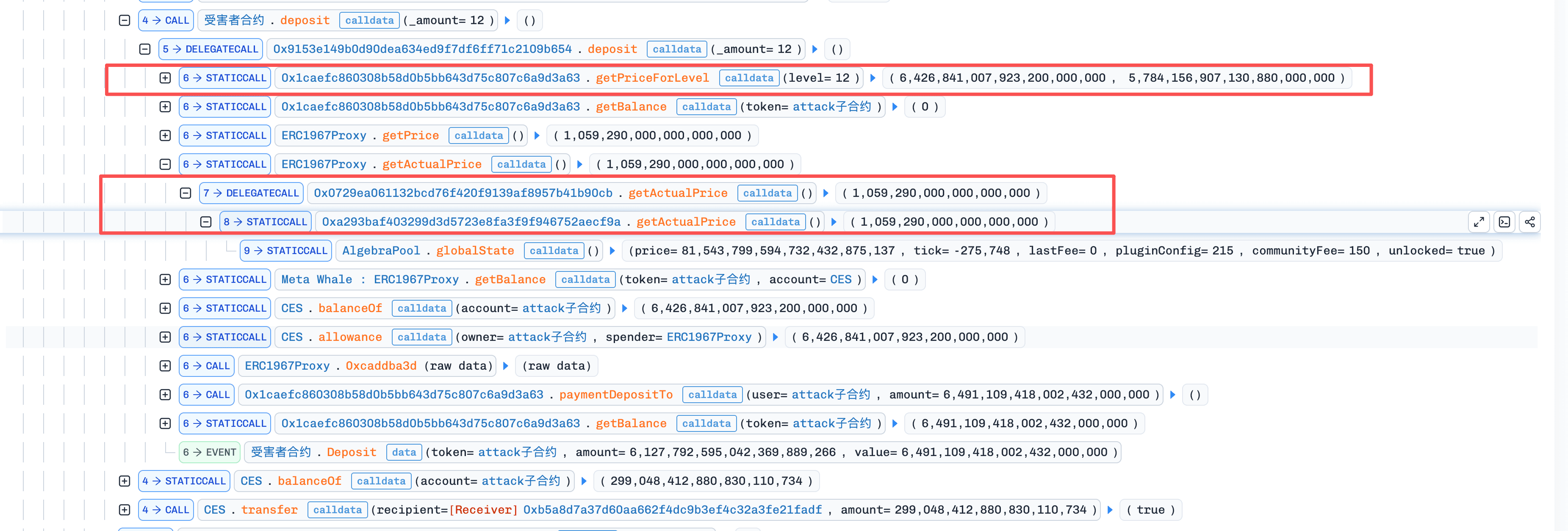 55,365e18CESfrom a Uniswap V3 flash pool and distributed the funds to 5 helper contracts. Each helper first received6,426e18CES, and then calleddeposit(12). During this process, each helper first queriedgetPriceForLevel(12)and then prepared the amount ofCESrequired for this deposit based on the current price.