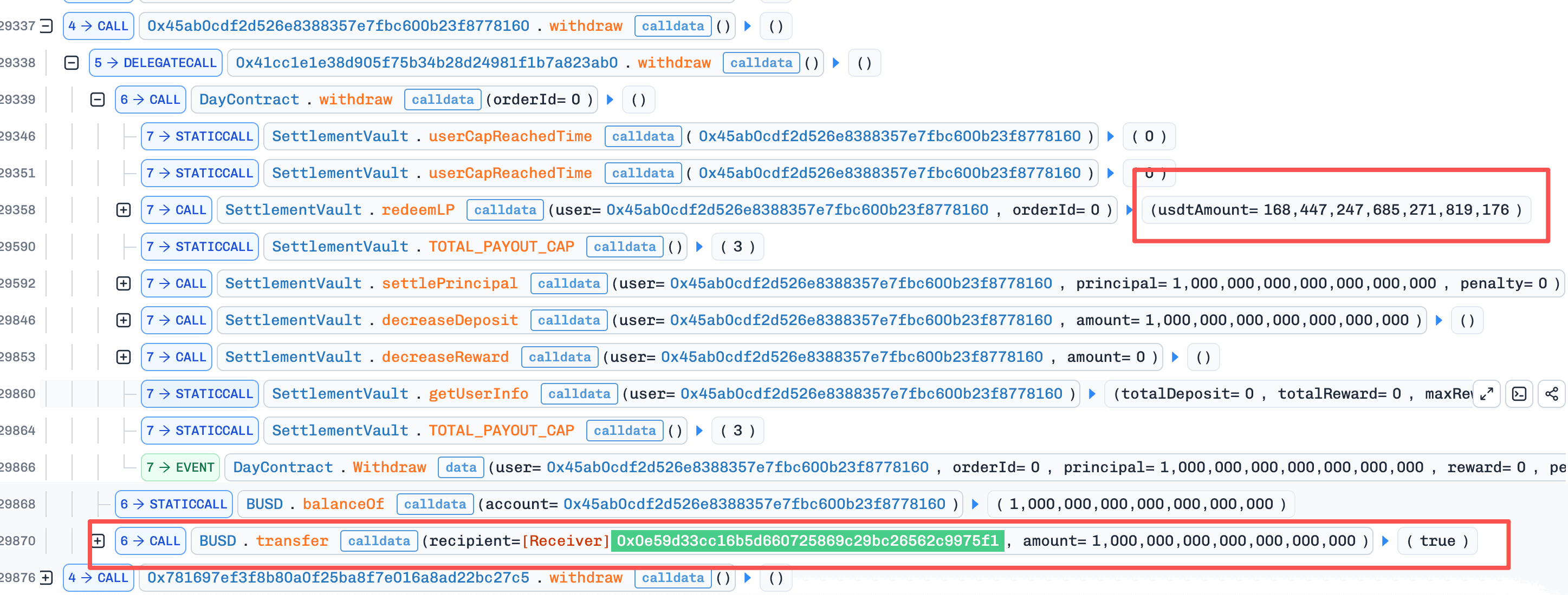 withdraw()on all staking positions opened in Step 2. At this point, the market value of the assets corresponding to these positions was already far below their initial deposit value. Under normal economic logic, full redemption should not have been possible. However, the protocol calculated the redeemableBUSDamount based on the historical deposit amount, allowing the attacker to fully recover all previously forced investment costs without bearing any loss.