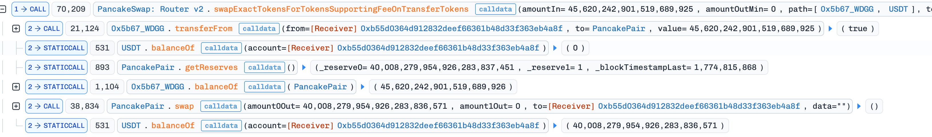 sync(), forcing the pair to update its reserves to match the manipulated token balances. As a result, theWDGGreserve in the pool was reduced to only 1 wei.