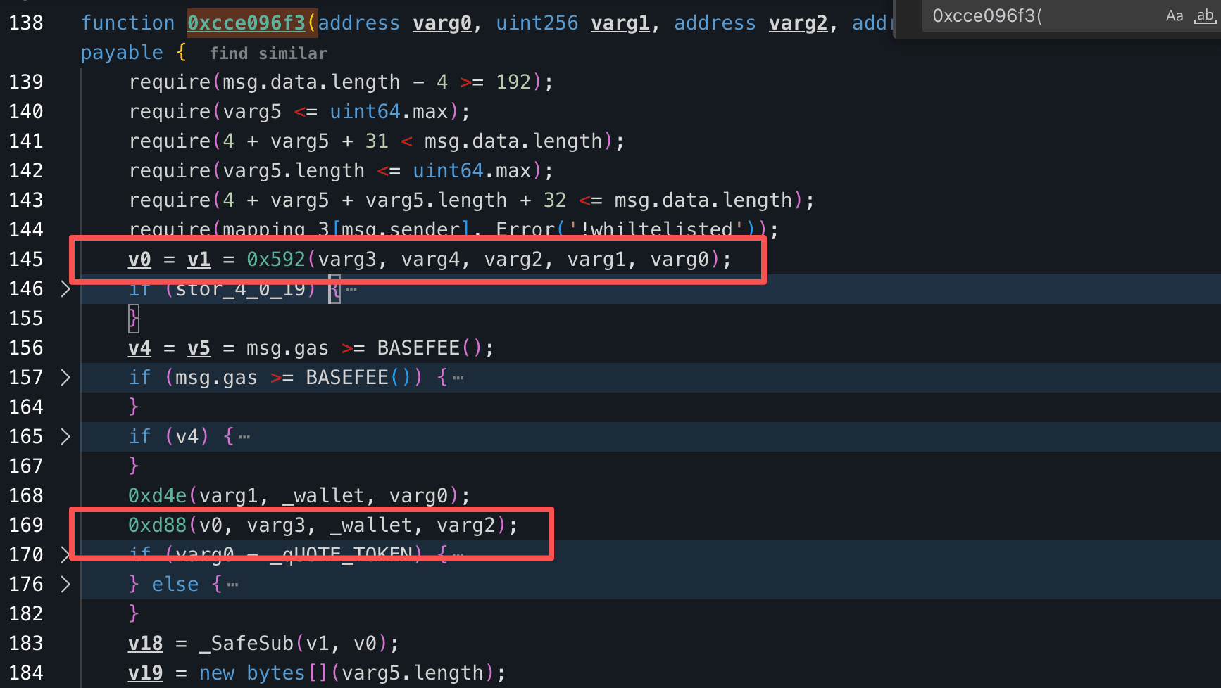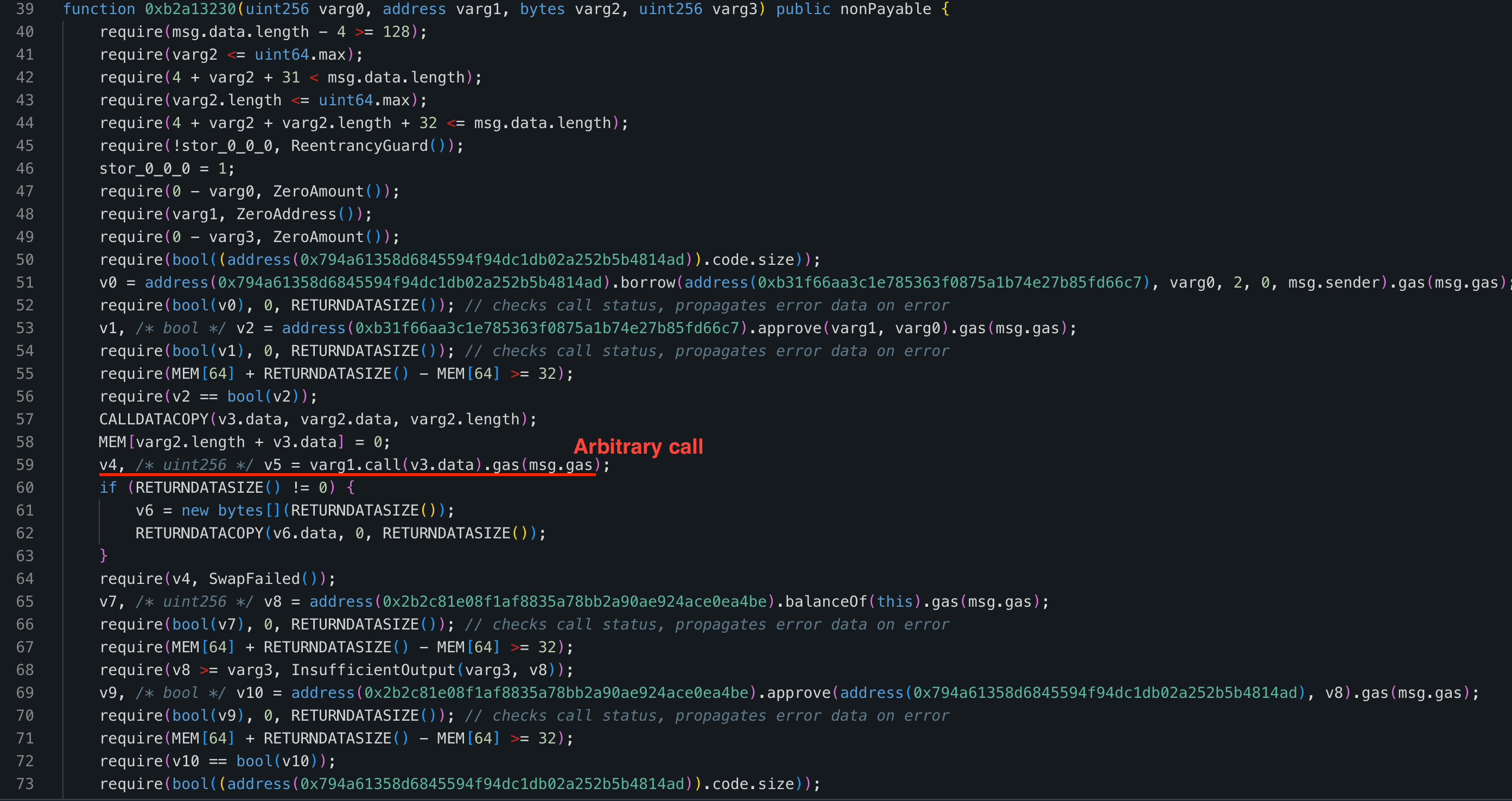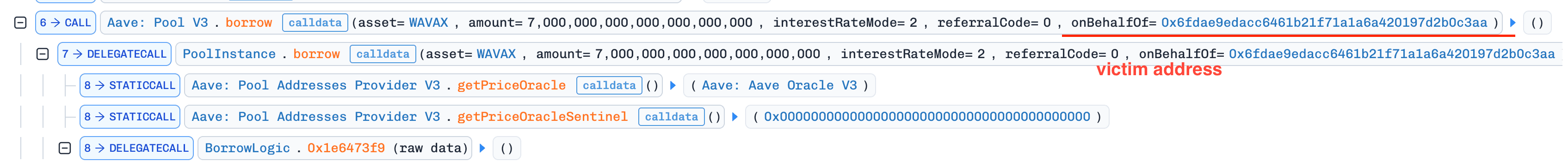 b2a13230(). The function first performed a normal borrow operation, then reached the arbitrary call section. At this point, the attacker crafted the call to directly invoke Aave V3'sborrow()function withonBehalfOfset to the victim address. Since the victim had granted credit delegation to the rebalancer contract, the borrow succeeded. The borrowedWAVAXwas transferred into the rebalancer contract.