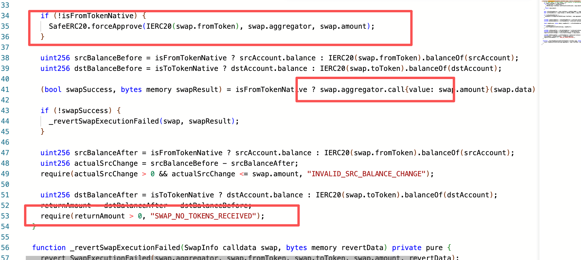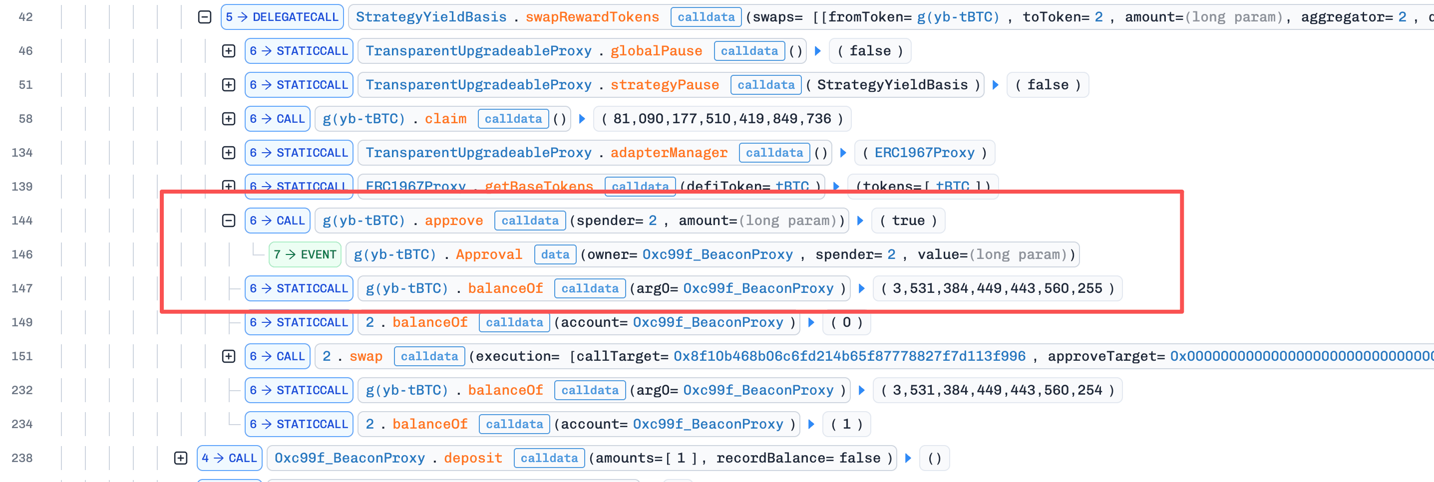 transferFromto move the vault's LP tokens directly into the malicious aggregator, completing the theft. This step lay outside the protocol's protected execution path entirely; by the timeexecuteSwap()returned, the allowance had already been written and the post-call balance check had already passed, so the protocol had no further opportunity to intervene.