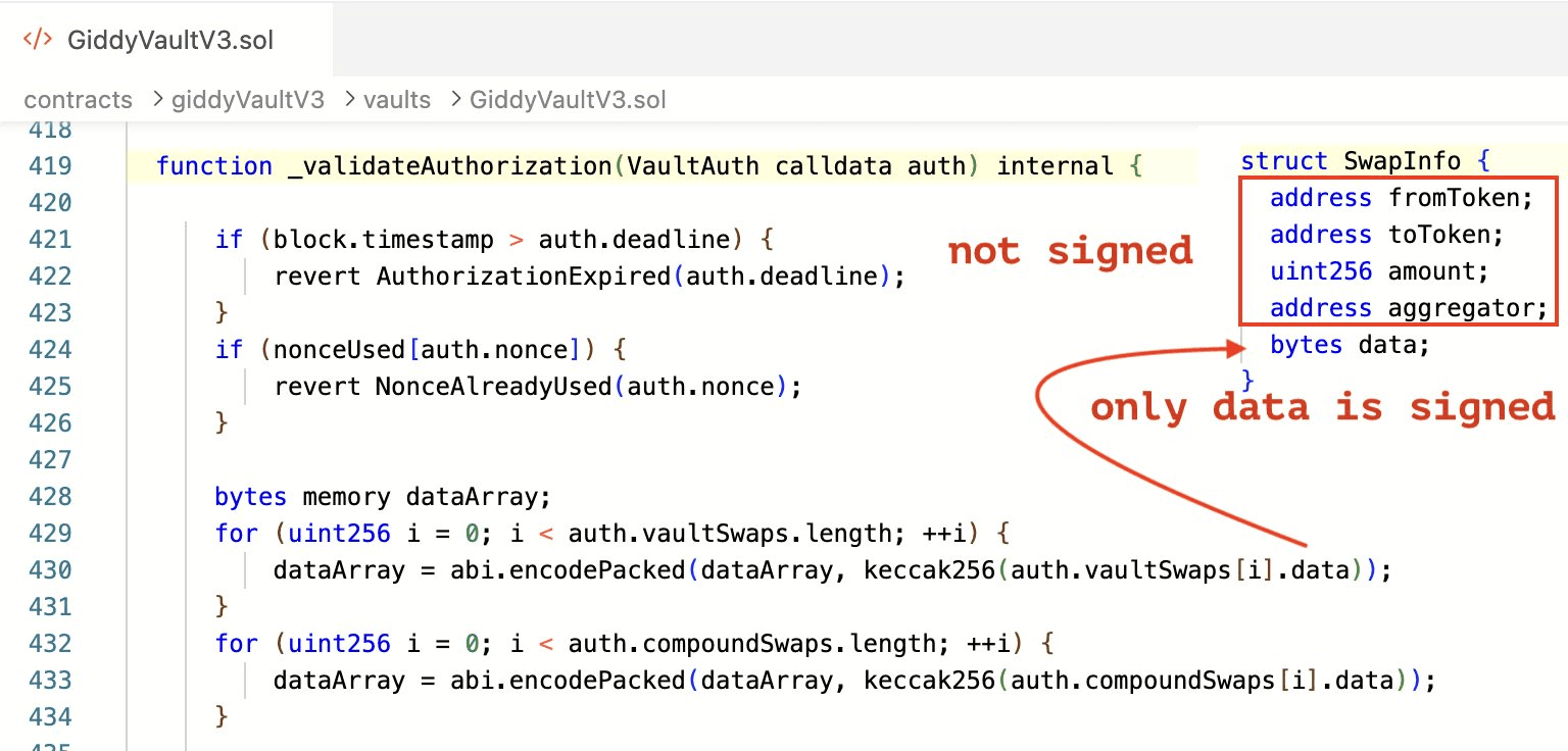 The vulnerability lies in the _validateAuthorization() function of GiddyVaultV3. When constructing the signed payload, only the data field of each SwapInfo is hashed; aggregator, fromToken, toToken, and amount are all excluded from the signature. This means anyone in possession of a valid signature can freely replace the remaining fields of SwapInfo while still passing signature verification.