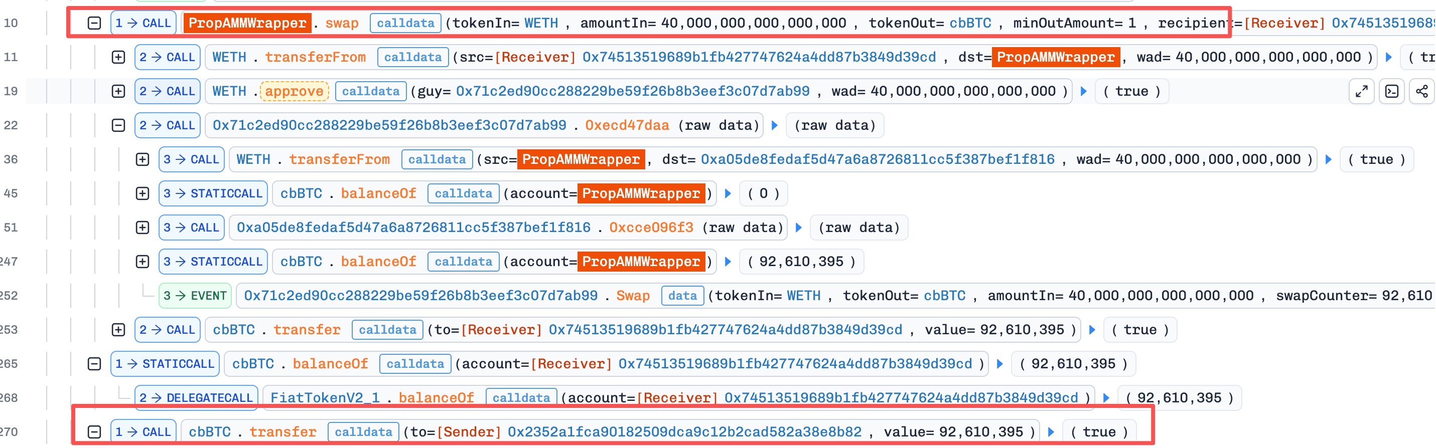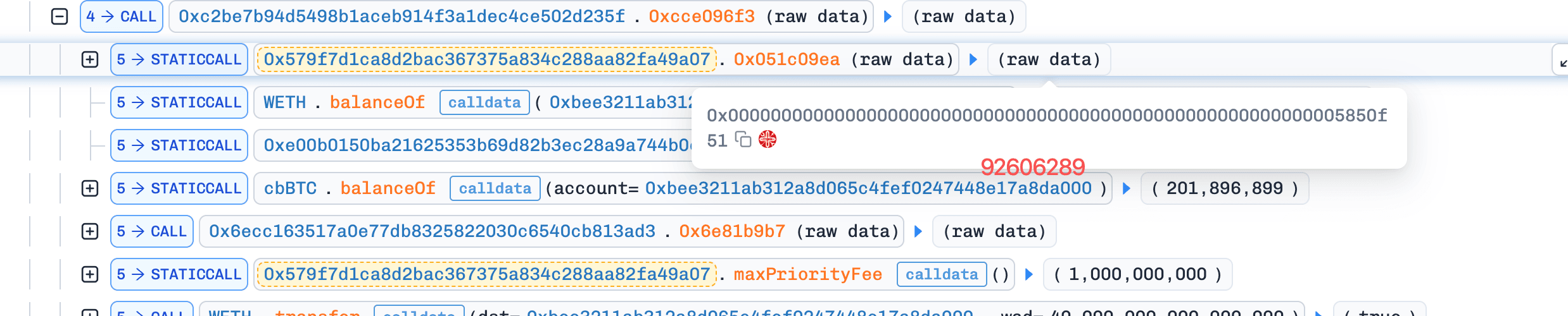 cbBTCtransfer amount. 0.04WETH(≈$95) flowed in viatransferFrom; 92,610,395 rawcbBTCunits (≈0.926cbBTC, ≈$72.35K) flowed out from the protocol wallet to the attacker.