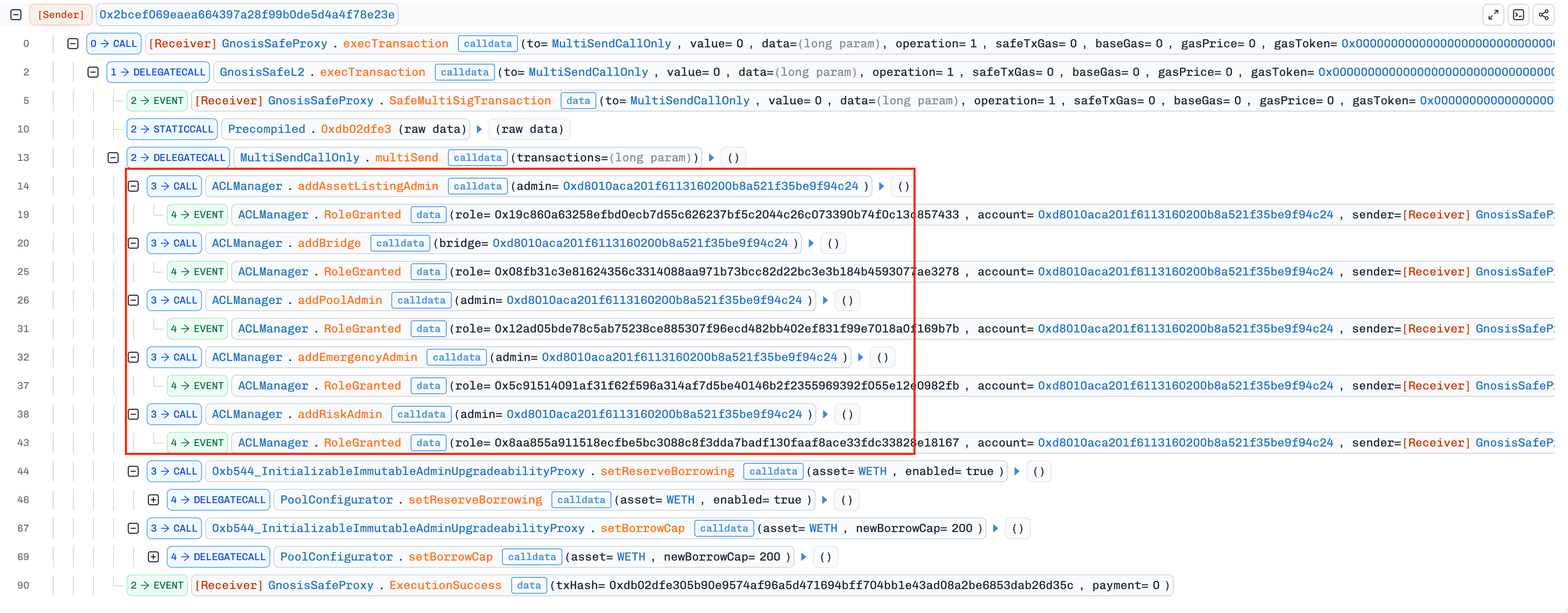 MultiSendCallOnlybatch viaGnosisSafeProxyto set themselves aspool admin,risk admin,bridge, andemergency adminthroughACLManager, then enabledWETHas a borrowable asset and set itsBorrowCapto 200.