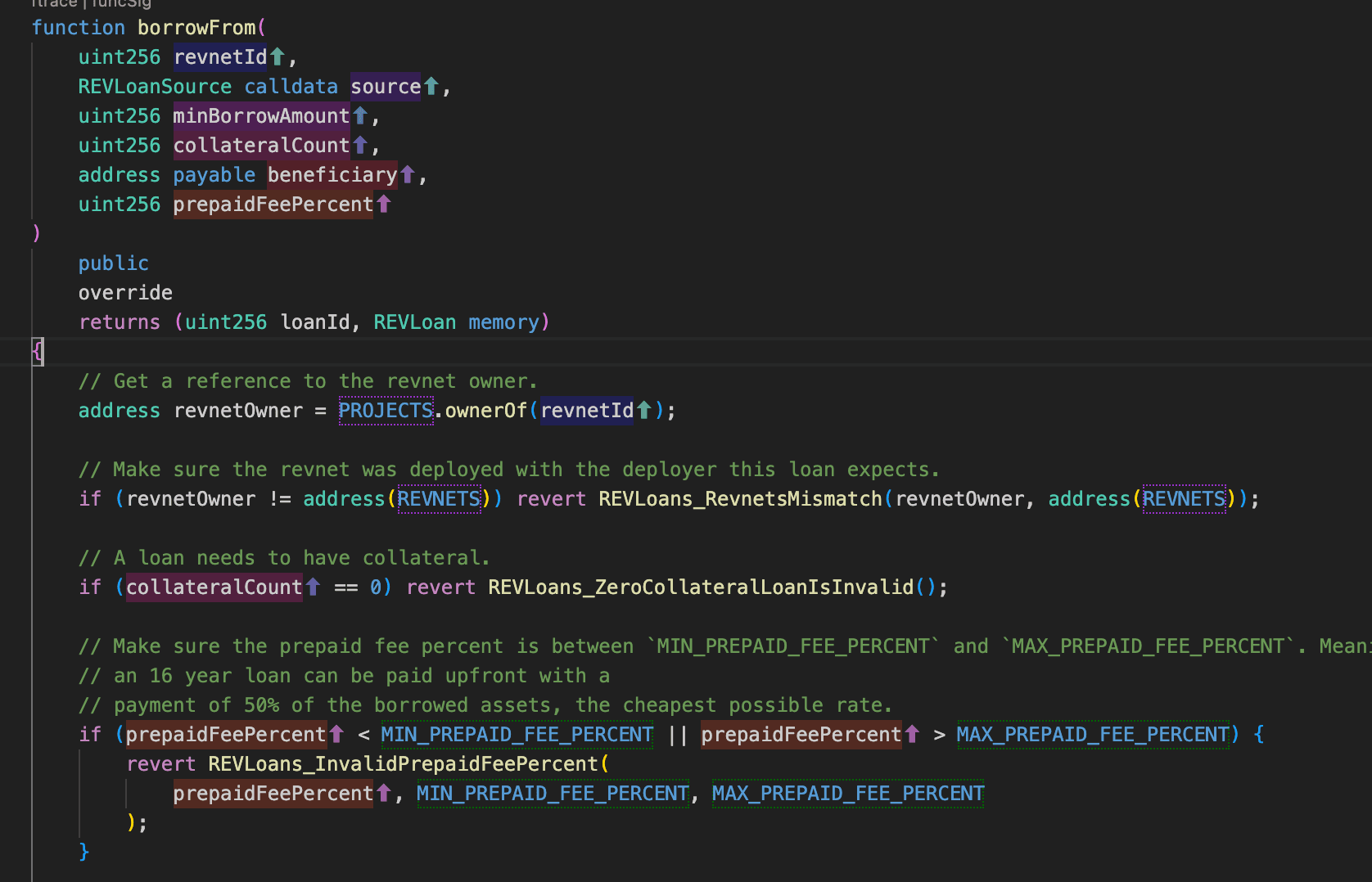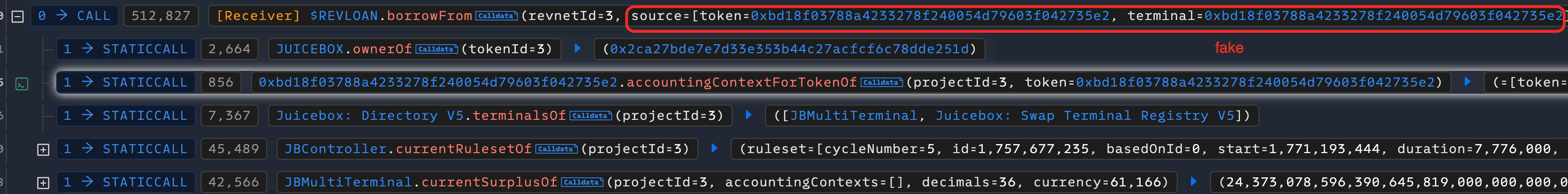 borrowFrom()with bothterminalandtokenin the loan source pointing to a fake contract, posting a small amount ofREVas collateral. REVLoans did not check whether the supplied terminal is registered for the revnet, nor whether the token is recognized by it.