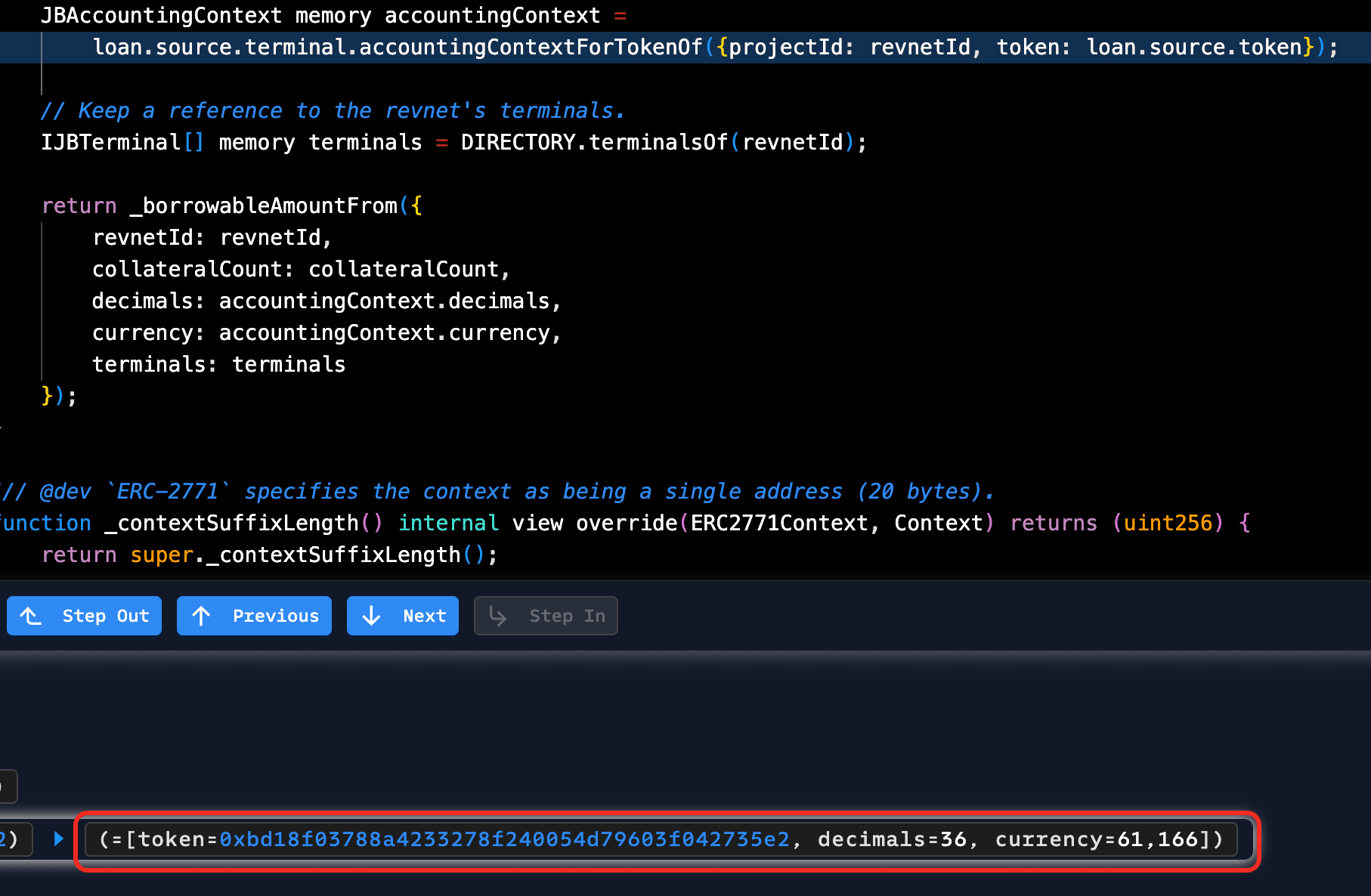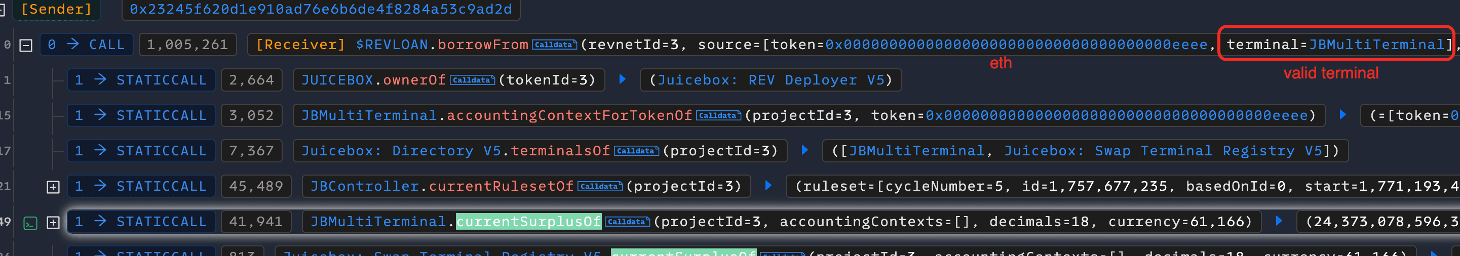 borrowFrom()again, this time passing the legitimateETHterminal as the loan source and a tinyREVcollateral. The cash-out math ran in real 18-decimalETHunits.