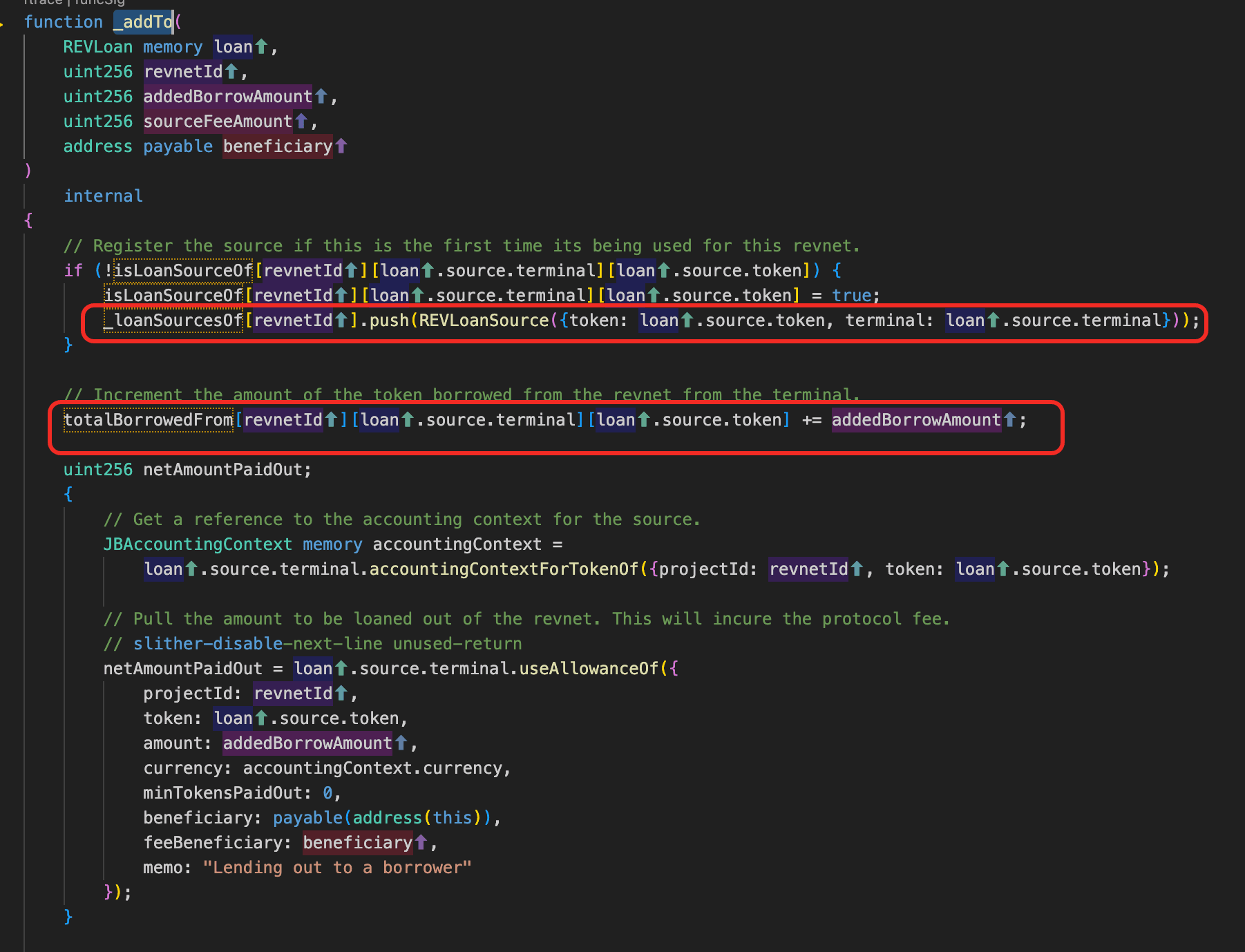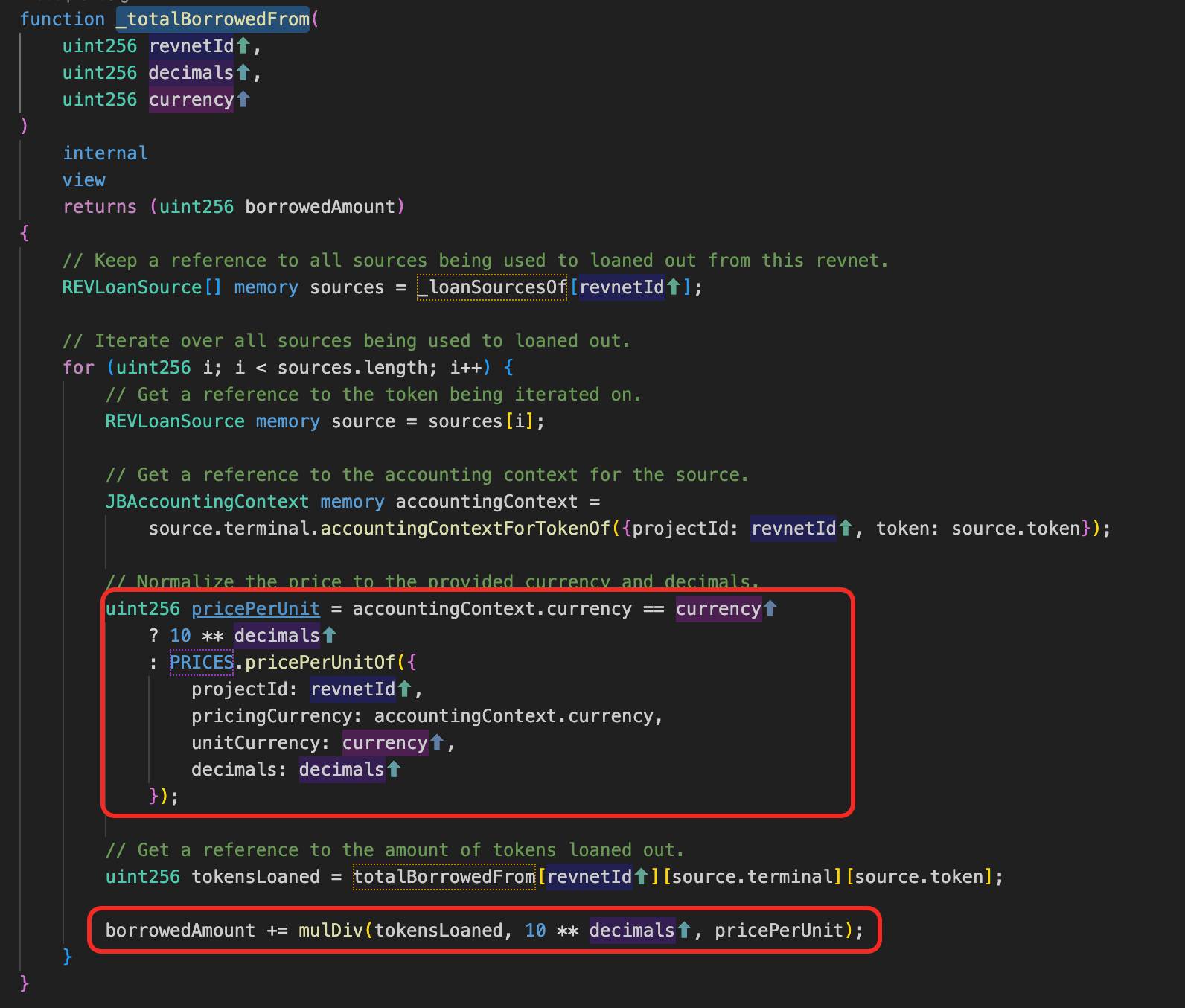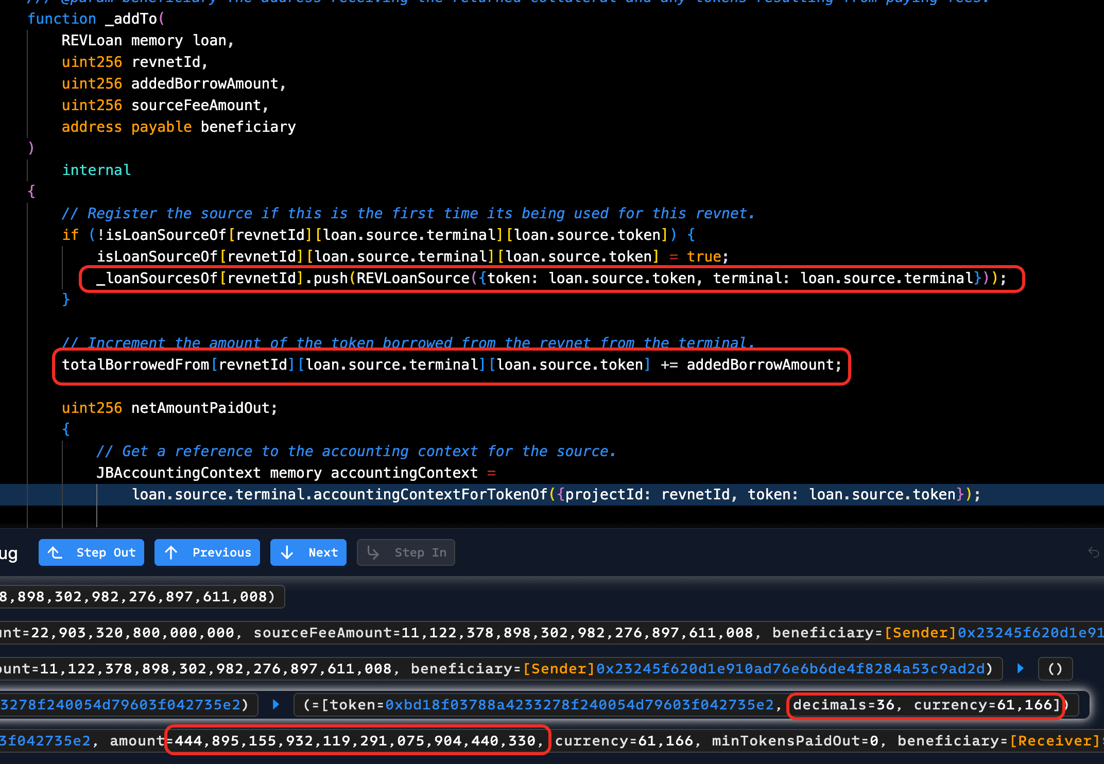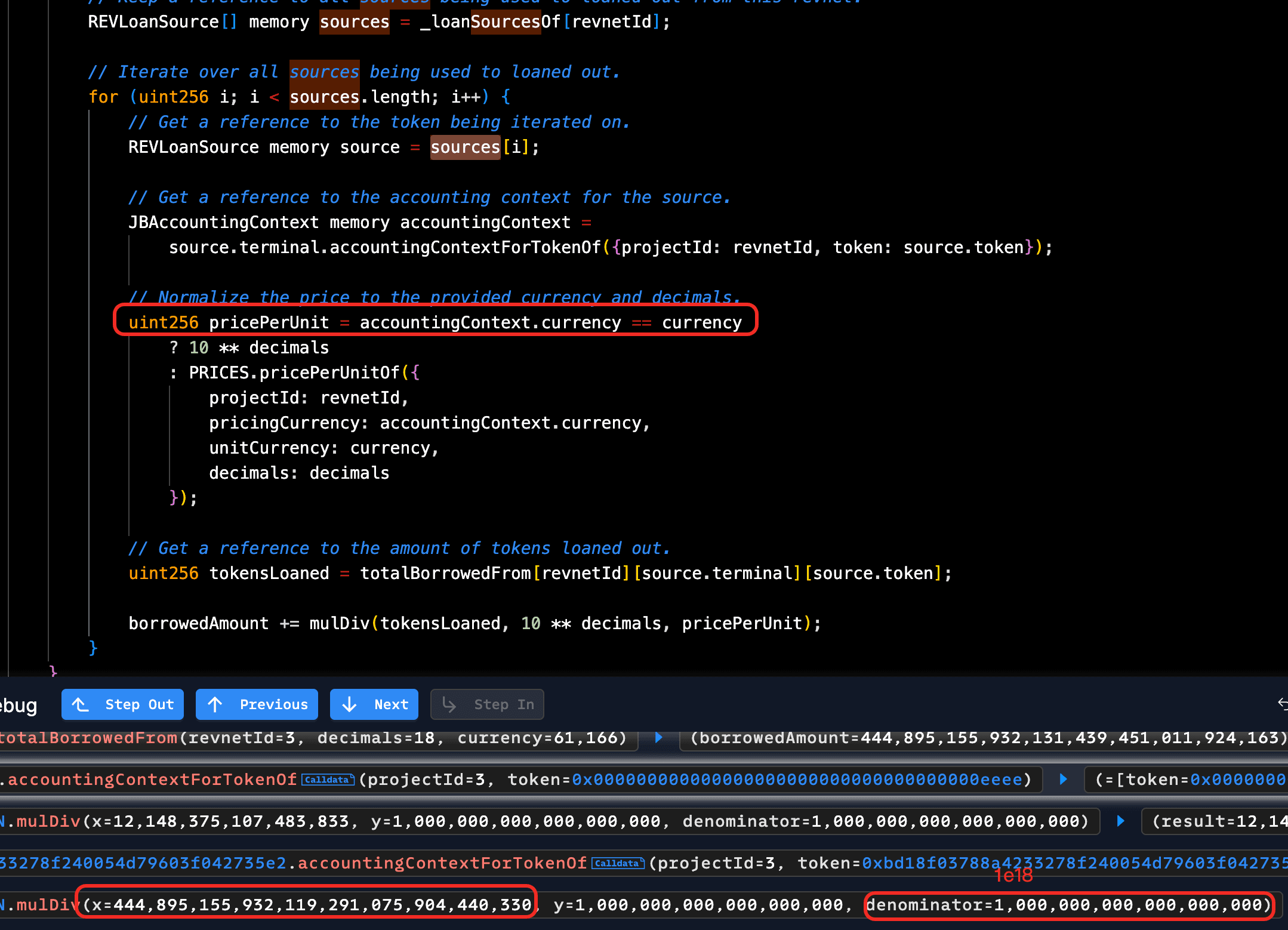 totalBorrowed, REVLoans iterated_loanSourcesOfand hit the entry from step 3. Because that entry'scurrencystill matchedETH, the same-currency shortcut fired again and the 36-decimal stored balance was folded into the 18-decimalETHsum 1e18 times too large.totalBorrowedwas now dominated by fake debt and the share-price numerator was massively inflated.