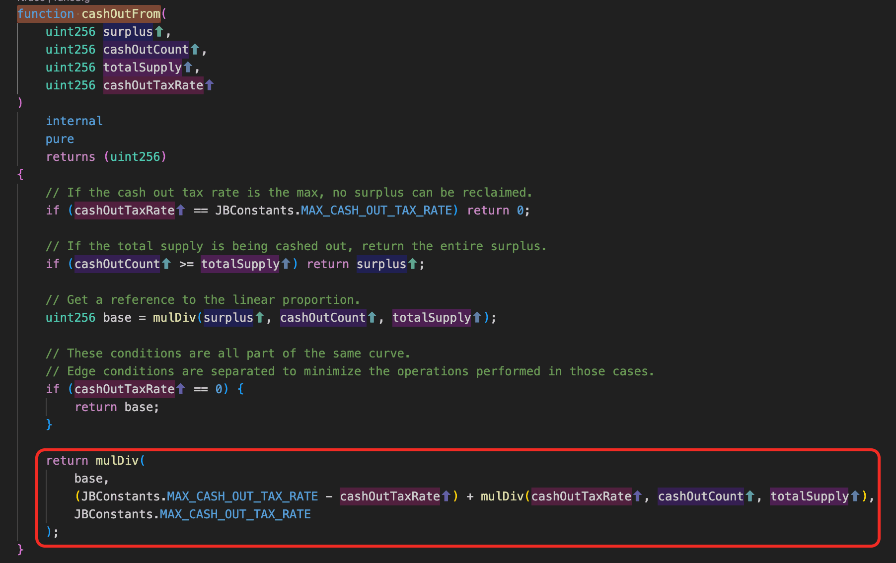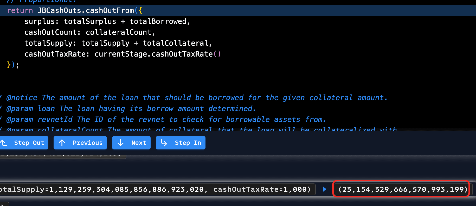 The amplification happens in cashOutFrom(). base = mulDiv(surplus, cashOutCount, totalSupply): with surplus dominated by inflated totalBorrowed, even a tiny cashOutCount (collateral) maps to a disproportionately large payout.