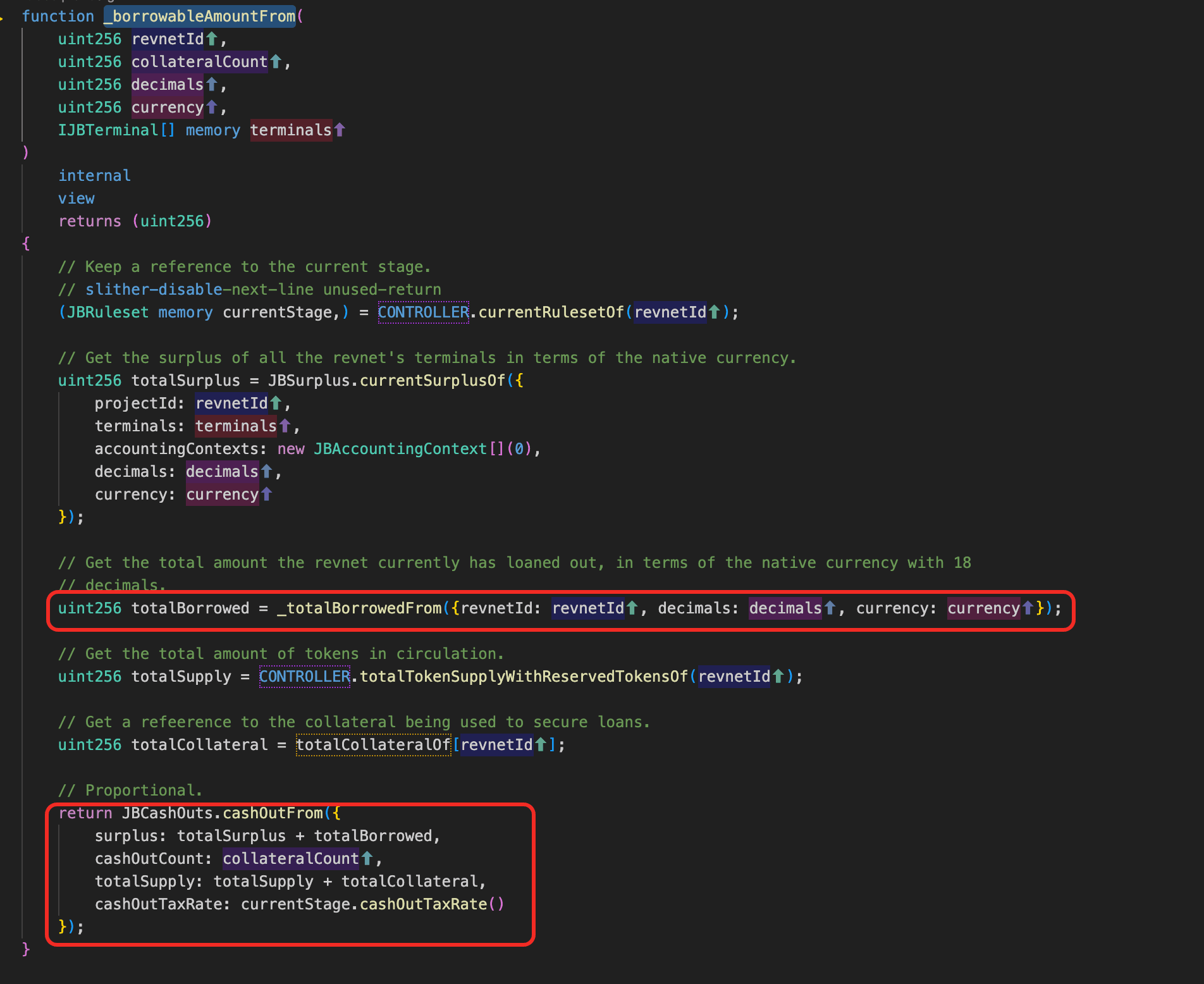 Once (source, revnetId) is in the bookkeeping, _borrowableAmountFrom() is the function that translates a borrow request into a payable amount. It builds surplus = totalSurplus + totalBorrowed from _totalBorrowedFrom(), then passes that surplus into JBCashOuts.cashOutFrom() together with the caller's collateral count and the share supply.