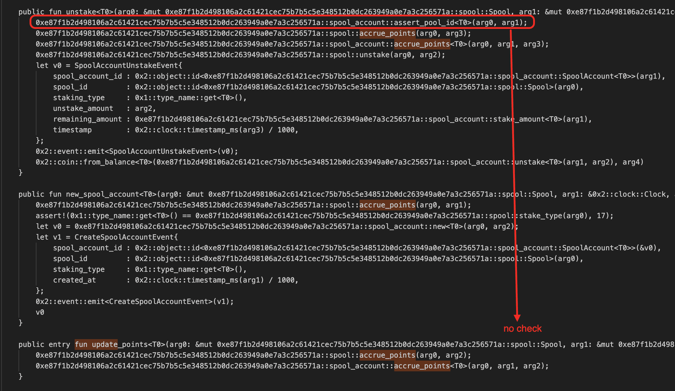 SUIas bait, the attacker mintedMarketCoin<SUI>, then callednew_spool_account+stakeagainst the target spool to create a legitimately boundSpoolAccountwithaccount.spool_id = target_spool. -