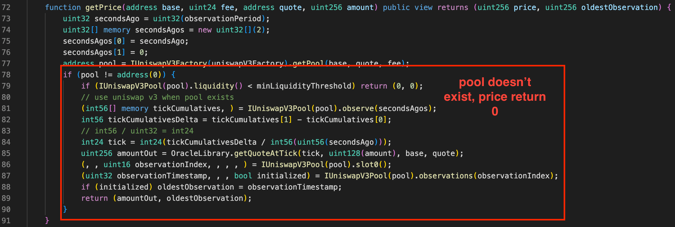 The defect is in the early-return branch of getPrice(). When IUniswapV3Factory.getPool(base, quote, fee) returns address(0) (no pool exists for the supplied fee tier), the function falls through and returns its zero-initialized price variable instead of reverting. The vault was deployed with fee=42, which is not one of Uniswap V3's supported tiers (500/3000/10000), so every non-USDC token's lookup hits this branch. totalAssets() therefore sums to roughly the vault's USDC balance only, while the actual yield-bearing tokens contribute zero. Mint and redeem ratios that depend on totalAssets() are computed against this near-zero denominator.