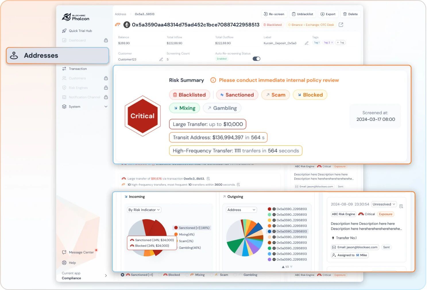 Anstatt sich auf einen einzigen Risikoscore zu verlassen, bietet Phalcon Compliance detaillierten Risikokontext wie Expositionspfade, Verhaltensindikatoren und historische Muster. Dies ermöglicht es Teams, zuversichtlich zu entscheiden, ob eine Transaktion zugelassen, überprüft oder eingeschränkt werden soll.