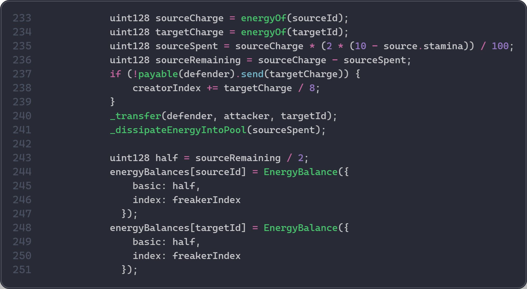 _transfer(defender, capturer, targetId)を呼び出してNFTを移動します。内部的には、_transfer()はERC-721フック_beforeTokenTransfer()を呼び出し、これはenergyOf(targetId)の0.1%で_dissipateEnergyIntoPool()を呼び出します。これは_dissipateEnergyIntoPool()への最初の呼び出しであり、ステップ5がまだ発生していないため、古い値を読み取ります。 - 行241: