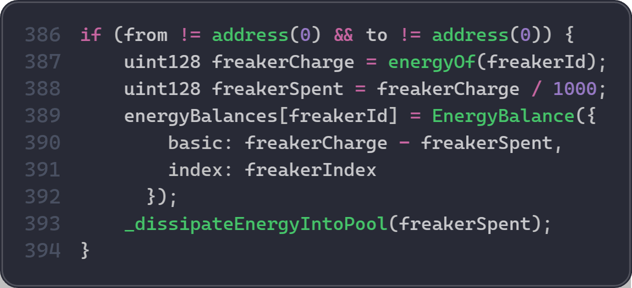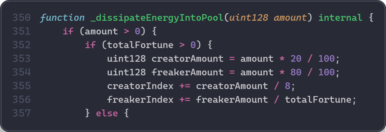 具体的には、会計式は energyOf = basic + (freakerIndex - index) * fortune です。freakerIndex は _dissipateEnergyIntoPool(amount) が実行されるときに増加し、amount の80%がすべてのFreakerに、20%がクリエイターに分配されます。charge() による直接入金は basic のみを増加させ、freakerIndex には影響しません。したがって、freakerIndex の増加は常に実際のEtherのシステムへの流入によって裏付けられる必要があります。freakerIndex が対応するETH流入なしに増加した場合、Freakerはコントラクトが実際に保持している以上のEtherを償還できます。