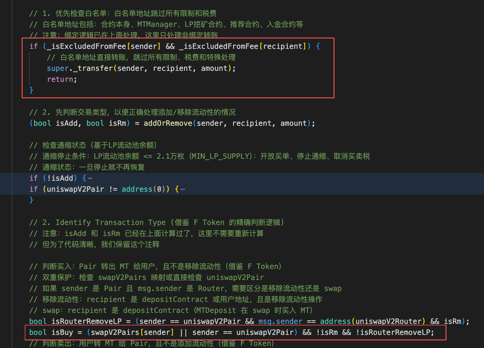 根本原因は、MTコントラクト(0x037E...b449)における買い制限設計の不備でした。通常の条件下では、攻撃者は制限フェーズ中にシードキャピタルとしてMTを取得することはできないはずです。しかし、コントラクトは正確に2e17 MTの転送を買いではなく紹介者バインディングアクションとして扱います。これにより、攻撃者は買い制限を回避して2e17 MTを購入できます。