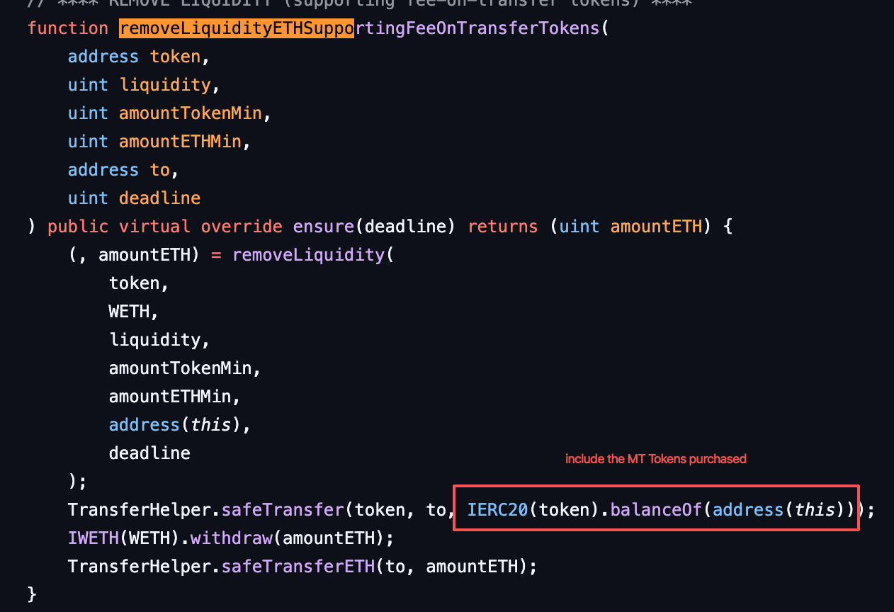 さらに、取引制限はisBuyブランチに依存して購入をブロックしますが、「Pair to Router」パスはカバーしていません。RouterとPairの両方がホワイトリストアドレスであるため、このような転送はホワイトリストチェックでショートサーキットし、買い制限ロジックに到達しないため、攻撃者はRouterに買いをルーティングし、その後流動性を除去することによってトークンを自分自身に抽出することによってMTを取得できます。