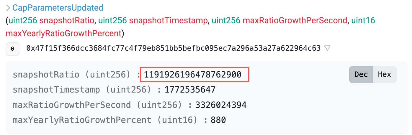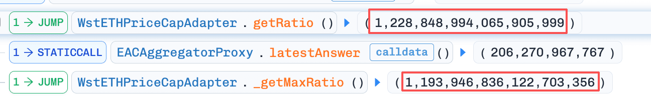 根本原因は、CAPOオラクルアンカー設定(0xe1D9...61Ef)における時間-比率の不一致でした。スナップショットタイムスタンプとスナップショット比率が設定されましたが、スナップショット比率が実際のwstETH/ETH比率を下回るように設定されていました。その結果、アダプターによって計算されたmaxRatioがライブ比率を下回り、getRatio()を下方クランプし、wstETH/USDオラクル価格を体系的に過小評価しました。この低下した担保評価は、wstETHを担保として使用するポジションのヘルスファクターを低下させ、本来健全なアカウントが不健康と誤分類され清算される原因となりました。