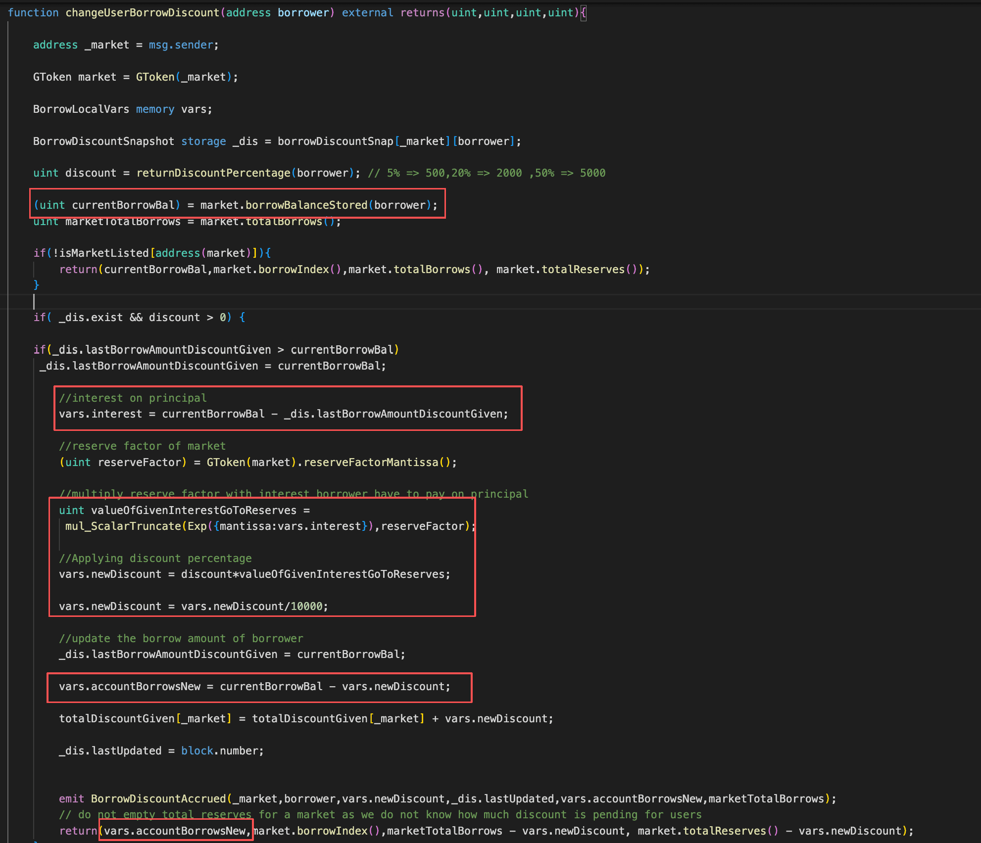 borrowを呼び出し、その後updateUserDiscountを呼び出すことを繰り返し、記録された債務を継続的に削減しました。