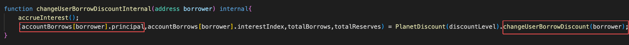 このインシデントは、Planet FinanceのchangeUserBorrowDiscount()における不適切な割引決済ロジックによって引き起こされました。このロジックは、借り手の保存された借入残高の増加を新たに発生した利息と誤って扱い、その差額に利息割引を適用します。攻撃者は、borrowの後にupdateUserDiscountを繰り返し呼び出すことで、記録された債務を過小評価し、最終的に真の負債よりも少なく返済して利益を抽出することができます。