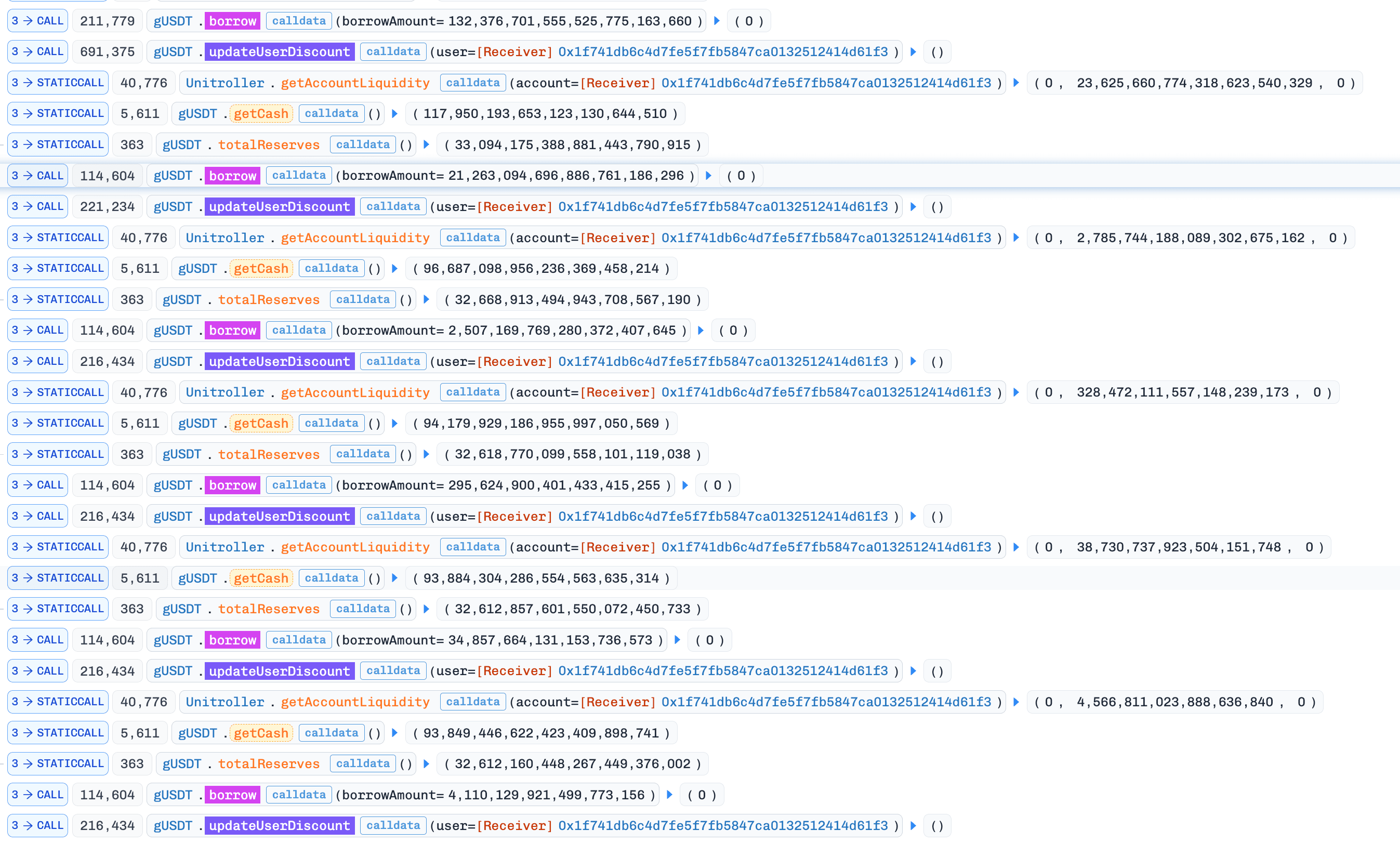 根本原因は、changeUserBorrowDiscount()で借り手の割引を決済する際に、プロトコル(0x4c9E...F467)が、借り手の保存された借入残高の増加を新たに発生した利息と誤って扱ったことです。その結果、本来発生した利息にのみ適用されるべき割引が、新たに借り入れた元本に誤って適用され、借り手の記録された債務が不適切に削減されました。攻撃者は、borrowしてからchangeUserBorrowDiscountループを繰り返すことで、過剰な割引を蓄積し、オンチェーンで記録された負債を真の借入額よりも一貫して低くし、最終的にその差額から利益を得ることができました。