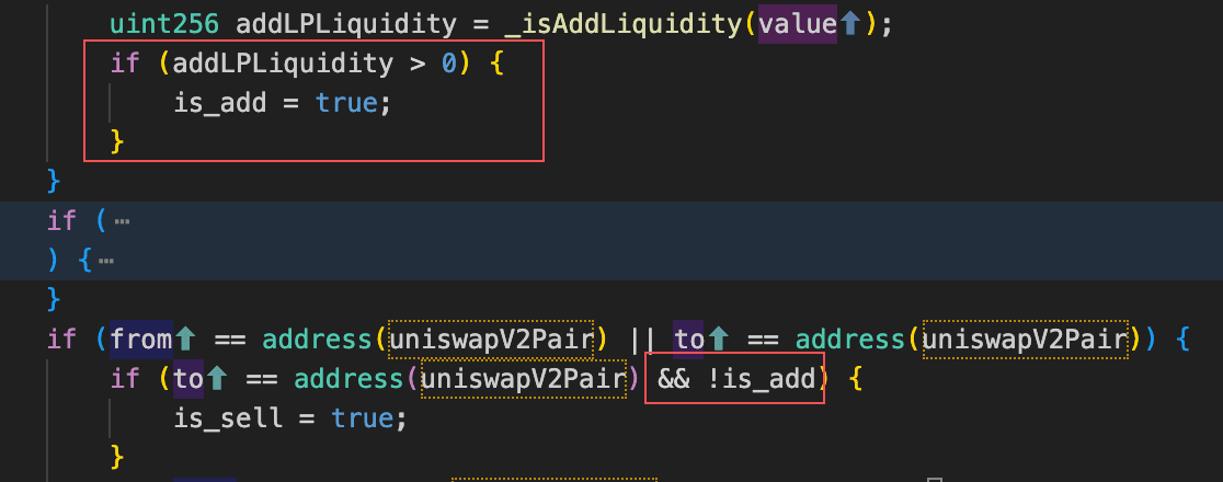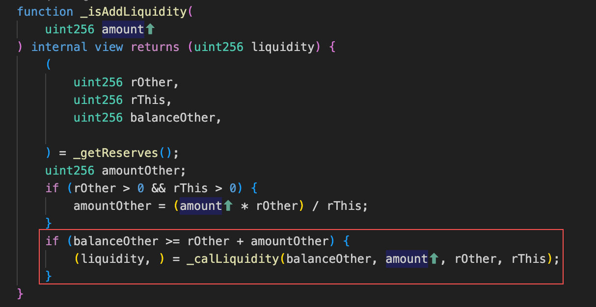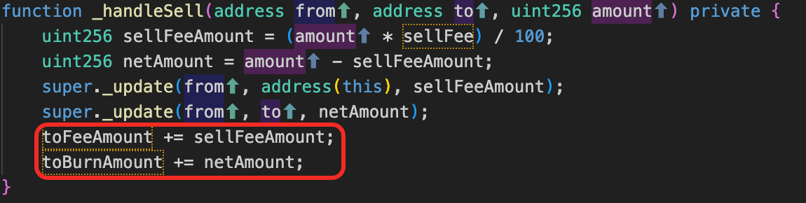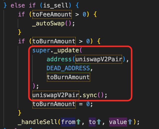 根本原因は、トークン(0x27f9...213f)の売却ロジックが、スワップされた全AM量をtoBurnAmountとして蓄積し、実際のバーンは次の売却時にAM/USDTペアからトークンを削除してpair.sync()を呼び出して準備金を更新することによってのみ実行されることです。この設計により、攻撃者はプールのAM準備金を操作し、オンチェーン価格を歪め、アービトラージを通じて利益を上げることができます。