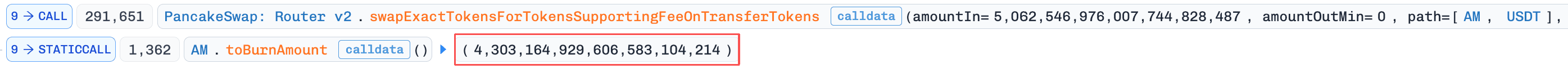 ~5,062e18AMトークンをUSDTにスワップし、コントラクトの記録されたtoBurnAmountを~4,303e18に操作。