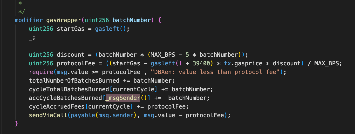 根本原因は、DBXenプロトコル(0xf5c8...2abd)におけるビジネスロジックの不備です。_msgSender()関数は、msg.senderがforwarderであるかどうかをチェックします。もしそうであれば、calldataの最後の20バイトを返しますが、この返された値はforwarderのコンテキストで任意に制御できます。しかし、burnBatch()はmsg.senderが保持するXENを直接バーンします。その結果、攻撃者はforwarderを介してburnBatch()を呼び出すことができ、プロトコルがforwarderが保持するXENをバーンし、forwarderのバーンサイクルレコードと手数料更新サイクルレコードを現在のサイクルに更新させることができます。しかし同時に、プロトコルはバーンされたXEN額を_msgSender()に対応するアドレスの下に記録します。