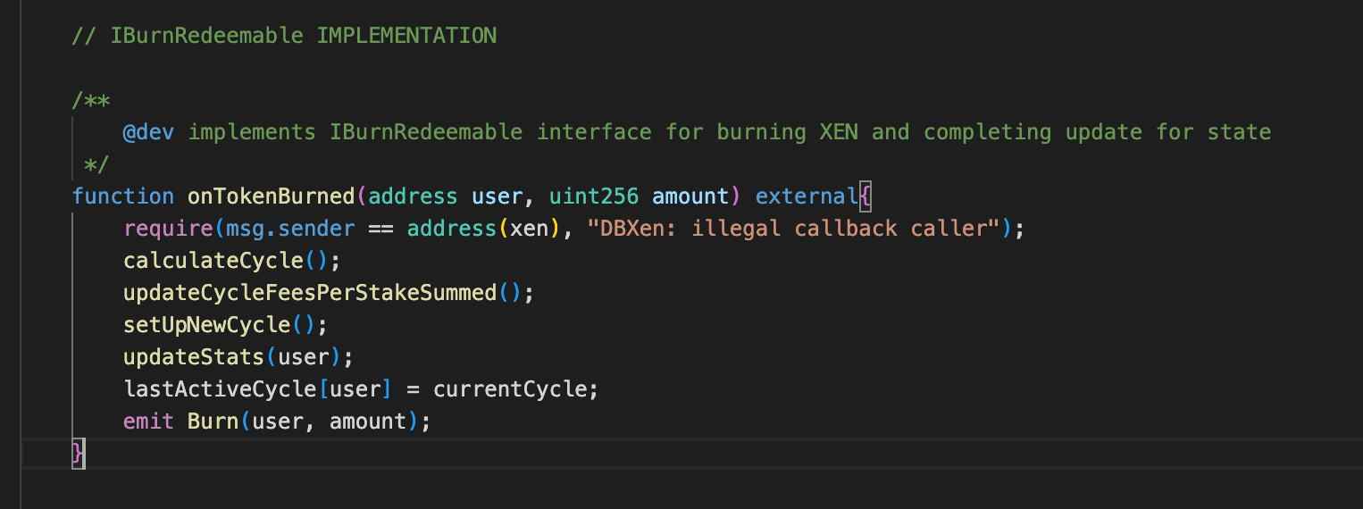 DBXenは、バーン・トゥ・アーン・プロトコルです。ユーザーはXENトークンをバーンする代わりに、DXN報酬と累積されたプロトコル手数料のシェアと交換します。主要なメカニズムはサイクルで機能します。ユーザーがburnBatch()を呼び出すと、2つのことが起こります。 (1) バーンされたXEN額は、呼び出し元のアドレス(_msgSender()で識別)の下に記録されます。 (2) XENコントラクトは、onTokenBurned()を介してDBXenにコールバックし、呼び出し元のサイクルレコード(バーンサイクルとlastFeeUpdateCycle)を現在のサイクルに更新します。