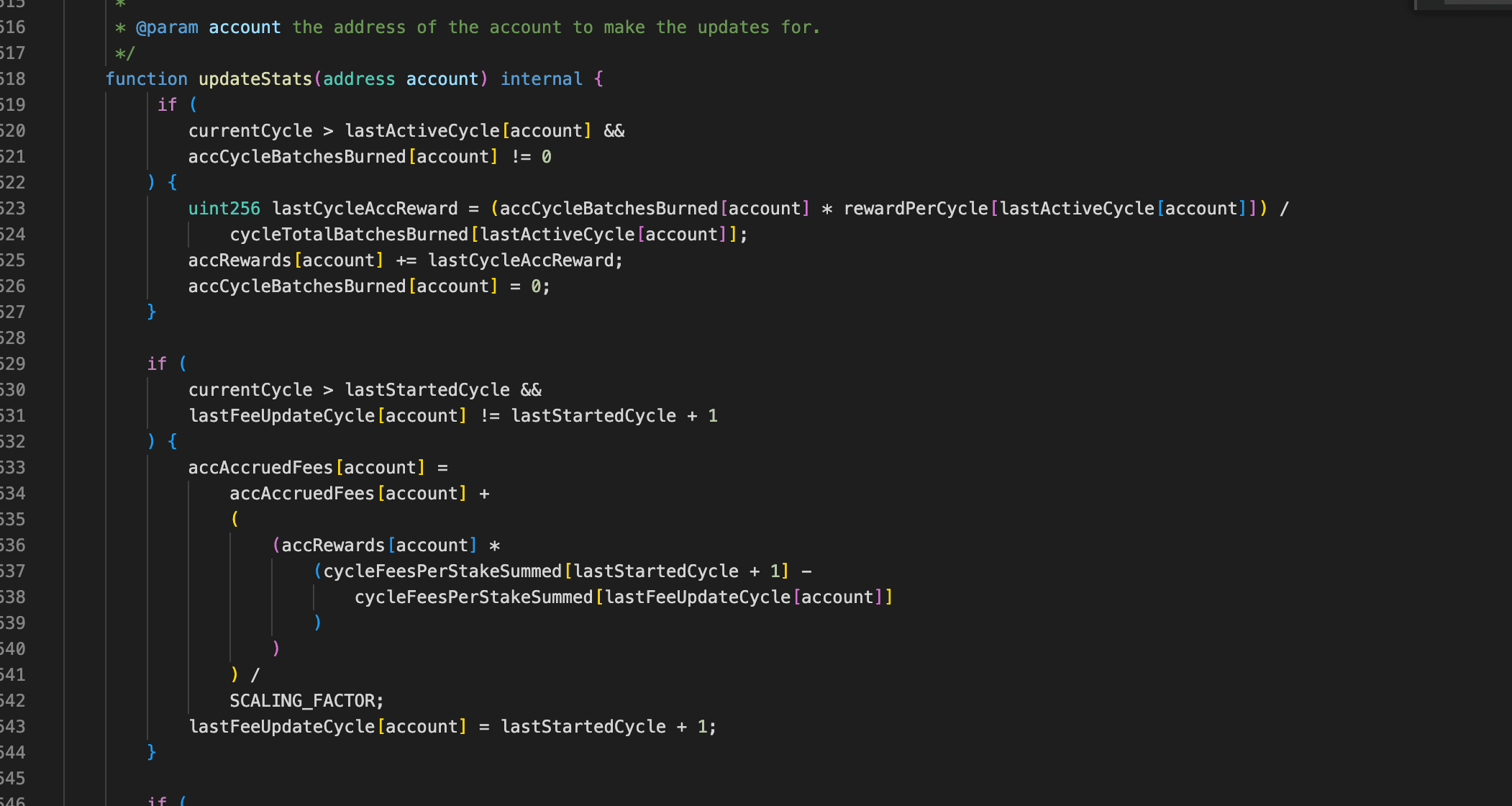 報酬と手数料はupdateStats()を通じて決済されます。報酬は、バーンサイクルでユーザーがバーンしたXENの総量に対するユーザーのシェアに比例します。手数料は、ユーザーの最後の記録サイクル以降に発生した累積プロトコル手数料に基づいています。両方の計算は、ユーザーのサイクルレコードが最新であることに依存します。