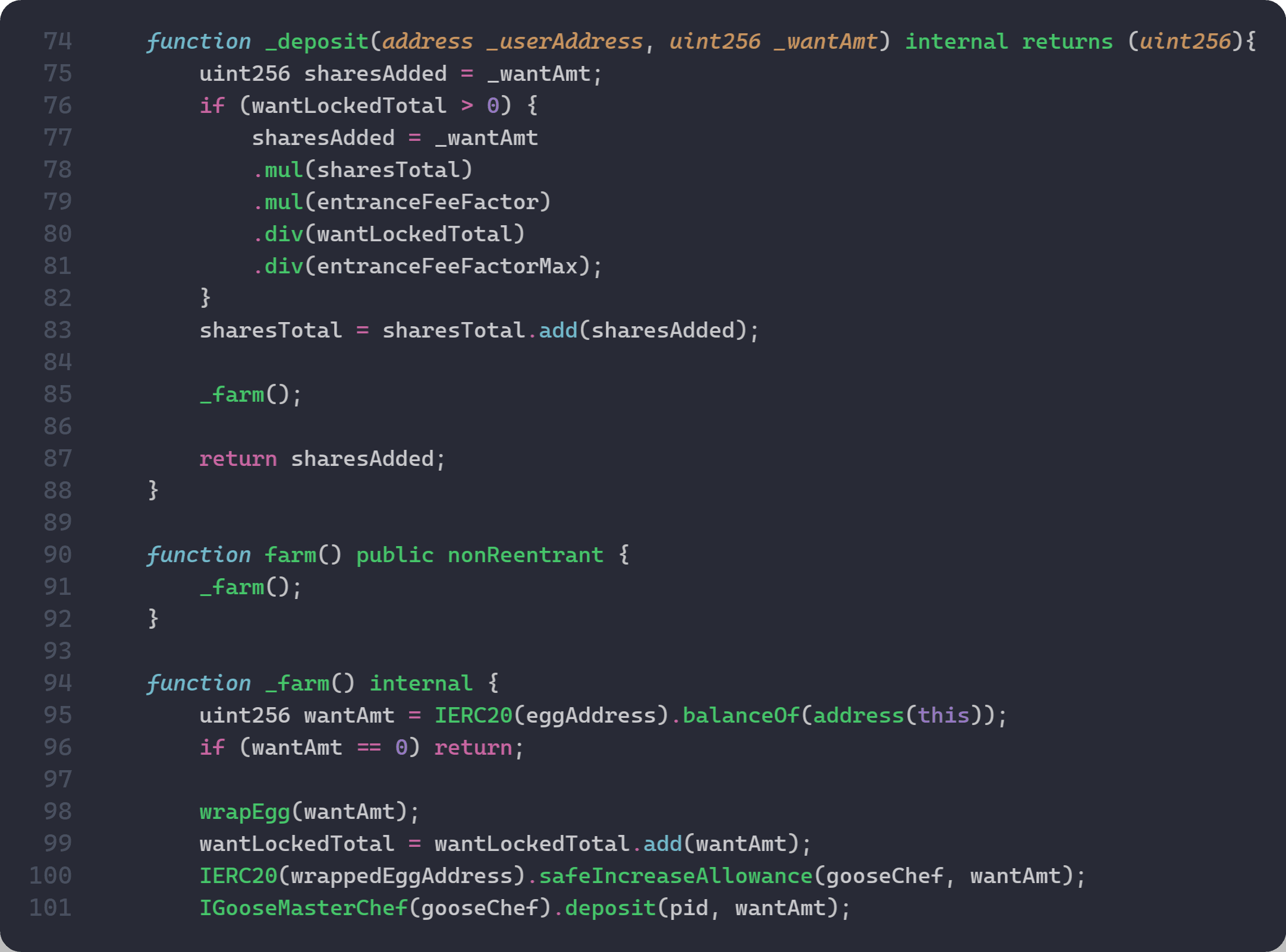 シェア価格設定の重要な会計上の期待は、価格設定時に戦略資産の総額(ステークされた元本と戦略が既に保有しているアイドル報酬)を反映することです。しかし、StrategyGooseEggでは、deposit()は_farm()がアイドル資産をwantLockedTotalに決済する前にシェアをミントしますが、withdraw()はMasterChefからの報酬収穫をトリガーできます。この順序が、以下の脆弱性分析の基盤となります。