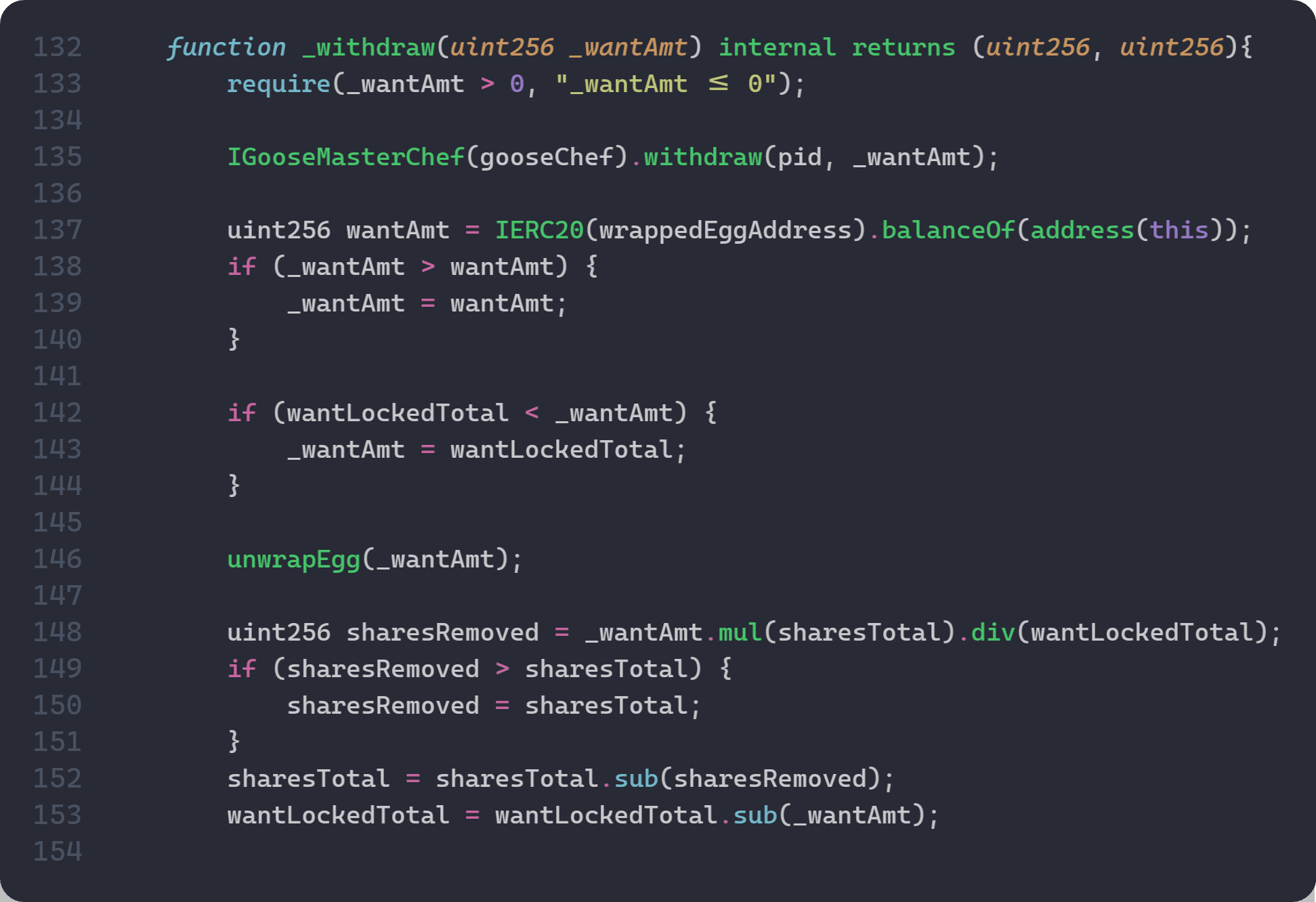 さらに、withdraw()はMasterChef.withdraw()を呼び出し、ステークされた元本と保留中のEGG報酬を戦略に返します。戦略の会計は、要求された_wantAmtをwantLockedTotalから差し引くだけなので、収穫された報酬は、wantLockedTotalに反映されることなく戦略の残高に残ります。これにより、実際に保有する資産と記録されたwantLockedTotalの間のギャップが広がり、その後のdeposit()シェア価格設定がさらに不正確になります。