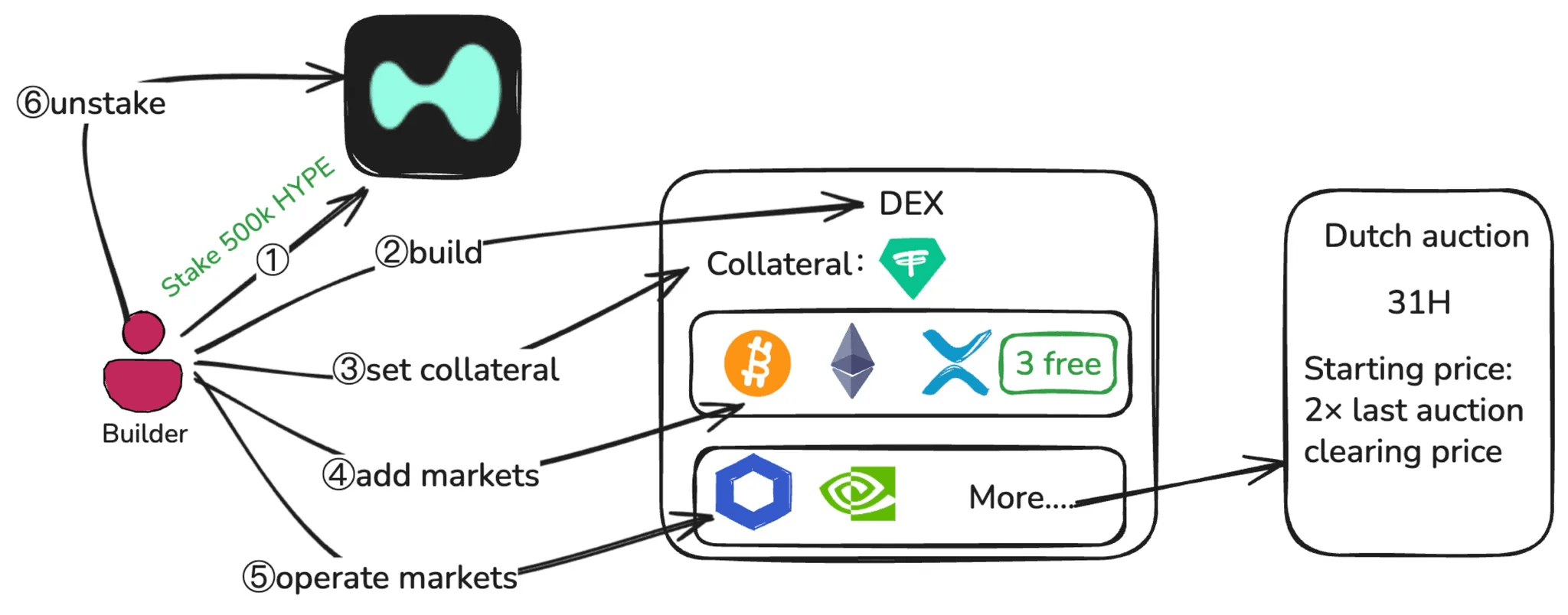 HIP-3 的核心叙述很简单。它将市场上市从由少数人控制的酌情流程转变为一个协议级别的能力,任何合格的构建者在满足要求后都可以调用。通过质押,构建者可以在 HyperCore 上部署自己的永续 DEX,免费上市一系列初始市场,并通过拍卖获得额外的额度。这使得市场扩张从等待批准转变为基于规则的、无许可的扩展。