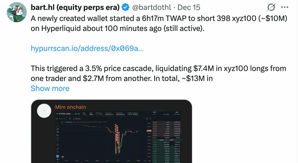 2025 年 12 月 14 日,trade.xyz 上的 XYZ100-USDC 市场(追踪纳斯达克 100 指数的永续合约)遭到操纵。一名攻击者卖空了 398 份 XYZ100(名义敞口约 1000 万美元 USDC),导致价格严重脱钩。大量多头头寸被清算,而清算本身进一步推低了价格,最终导致约 1300 万美元 USDC 的多头方清算。