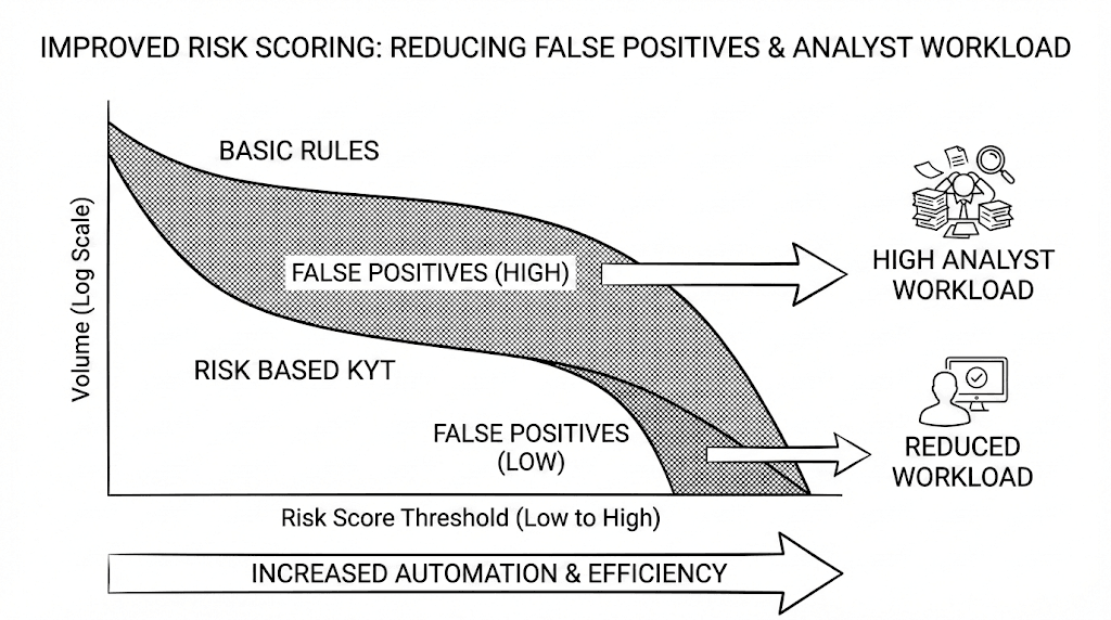与一次性检查不同,KYT 是一项持续的努力。它在交易发生时对其进行评估,并根据多种信号进行判断,例如总金额、频率、涉及的交易对手方、行为模式以及风险暴露。