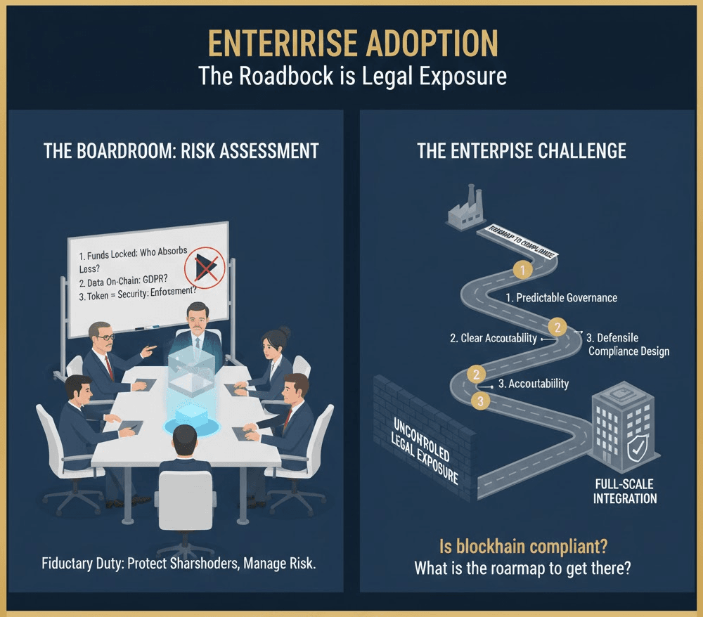 这就是为什么企业采用进展缓慢。不是因为害怕创新。而是因为害怕不受控制的法律风险。在区块链系统展示出可预测的治理、清晰的问责制和可辩护的合规设计之前,许多董事会仍将暂停,然后再批准全面集成。