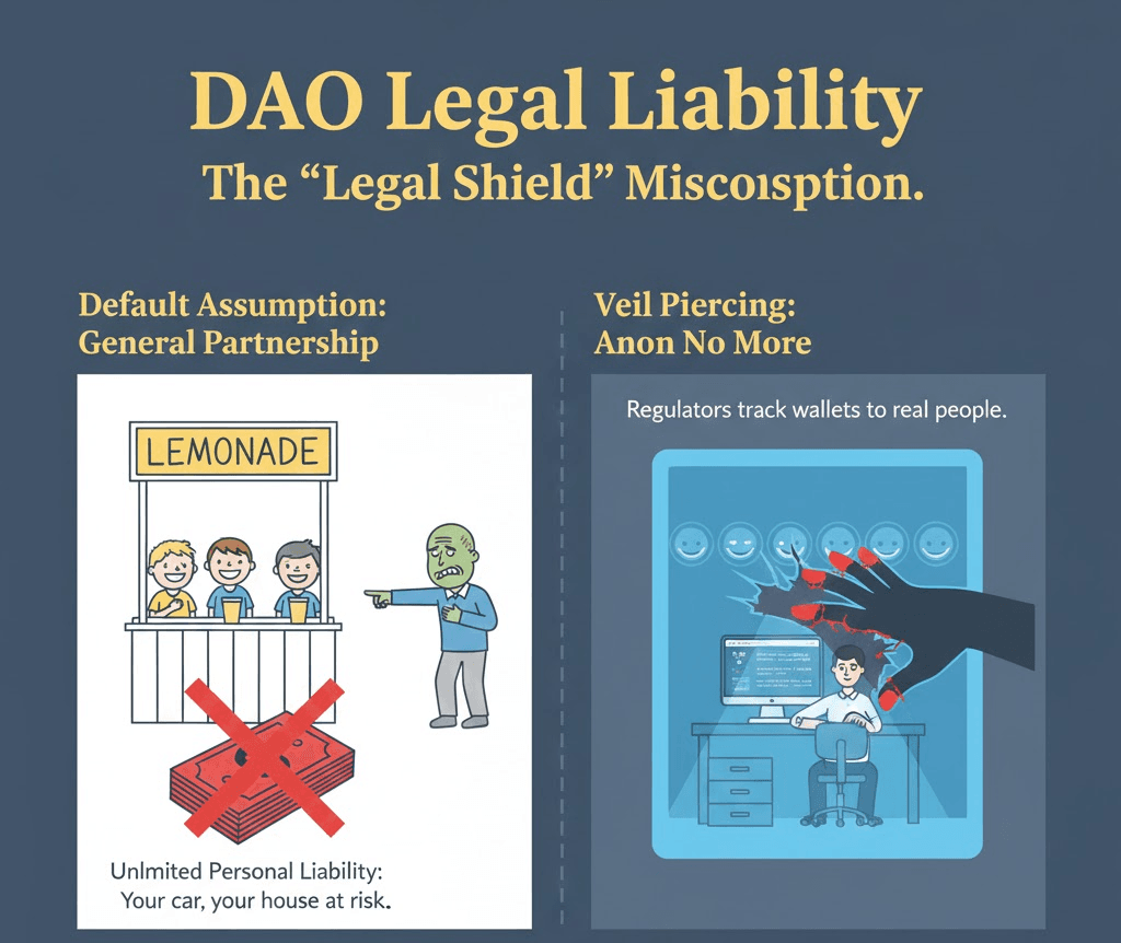 最大的误解是,“去中心化”让您隐形。事实并非如此。如果法律“穿透面纱”,那就意味着他们正在拆毁那堵墙。他们会辩称,DAO 只是一个“幌子”,屏幕后面真正的人才是欠钱的人。
