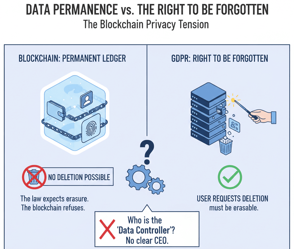 区块链的设计宗旨是记住一切。对开发者来说,这感觉像是一种安全。对监管机构来说,这可能看起来像是一个法律问题。尤其是在欧洲联盟等地区,GDPR 等隐私法赋予了人们一项强大的权利:“被遗忘权”。