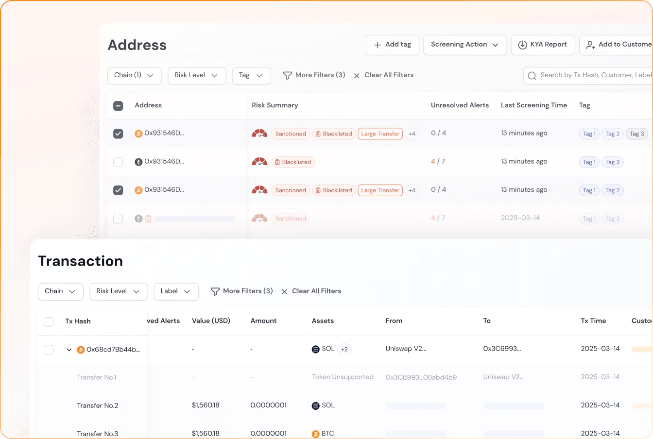 在接受存款之前,您需要立即评估来源地址。如果一个钱包与制裁、漏洞利用、混币器或其他高风险实体相关联,您必须在入金时进行检测。早期检测可防止流动性污染,保护银行关系,并降低下游调查成本。